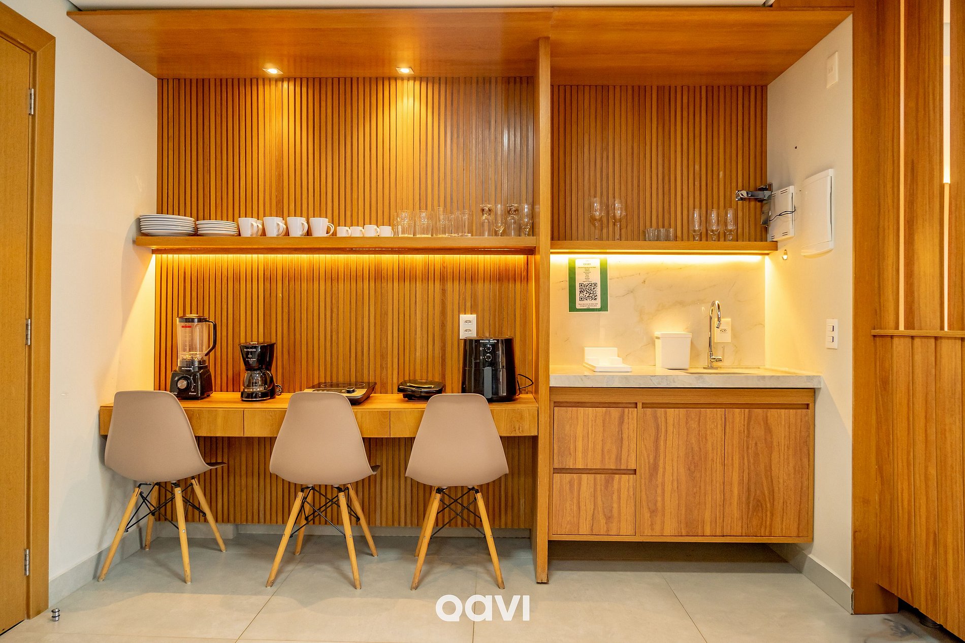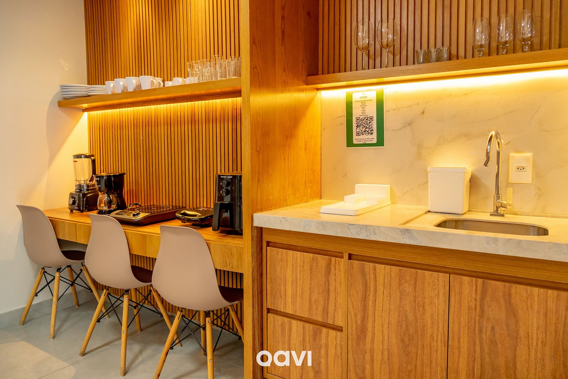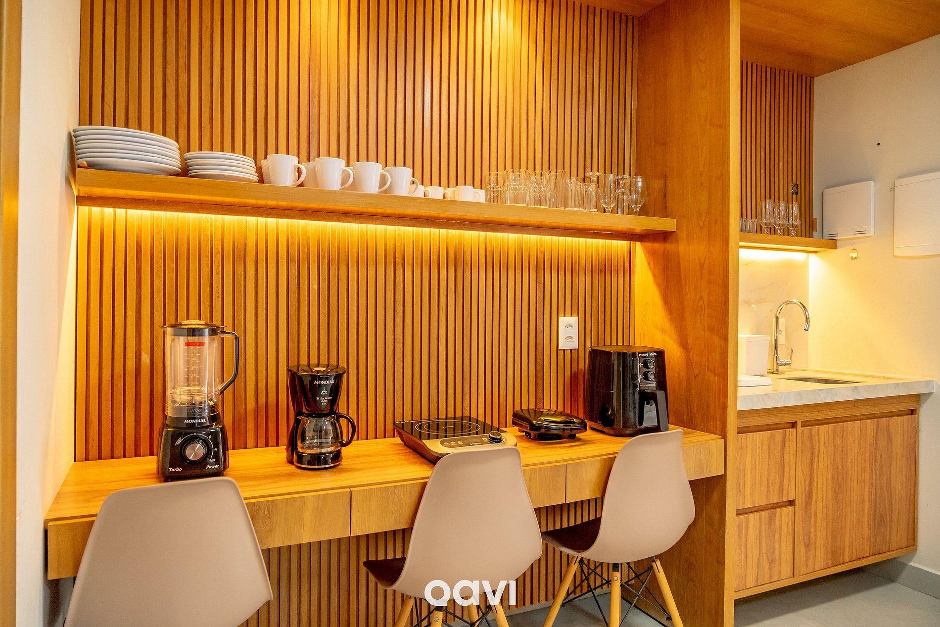 - Cozinha compacta: utensílios de cozinha (jogo de talheres, copos, pratos, frigobar, torradeira, cafeteira, air fryer, forno elétrico de uma boca e liquidificador);