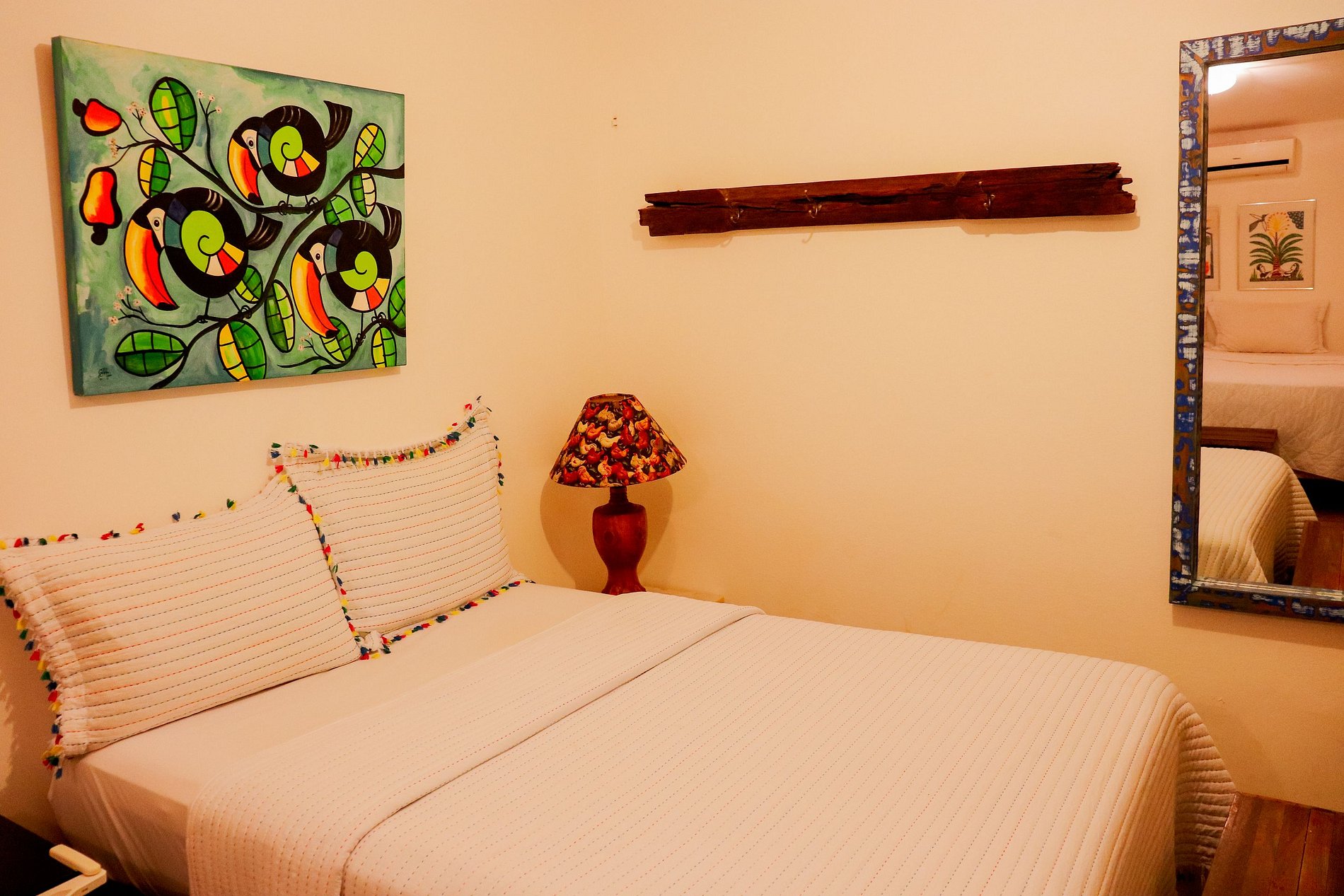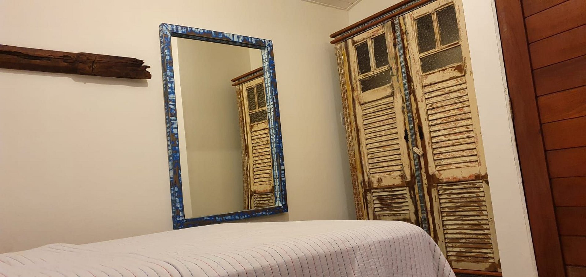 Quarto 1: 01 cama casal, ar-condicionado, 02 abajures, espelho, 01 mesa de cabeceira, 01 bancada de madeira e decorativos;