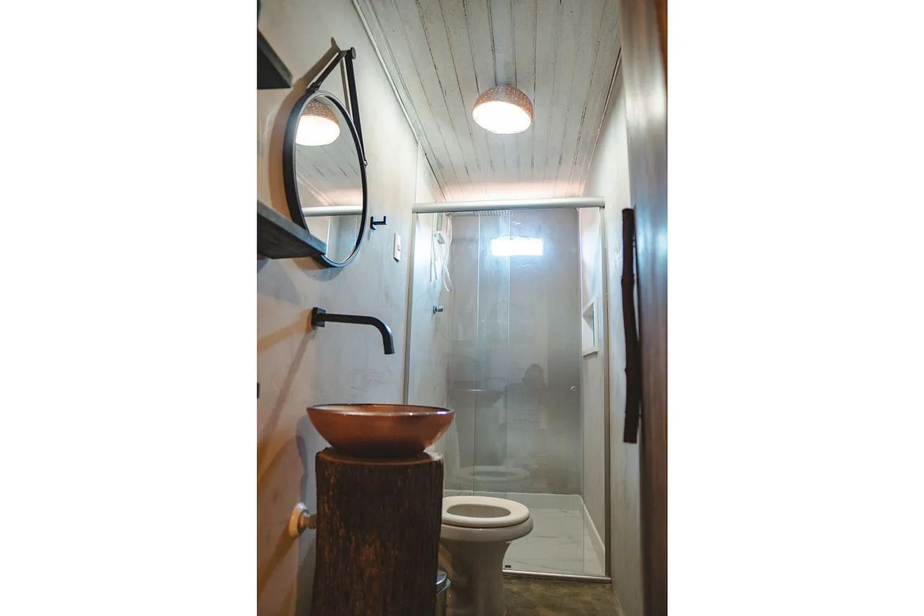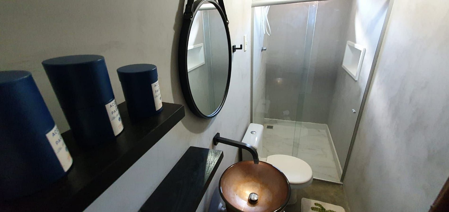 Banheiro: chuveiro elétrico, espelho, box e porta objetos.