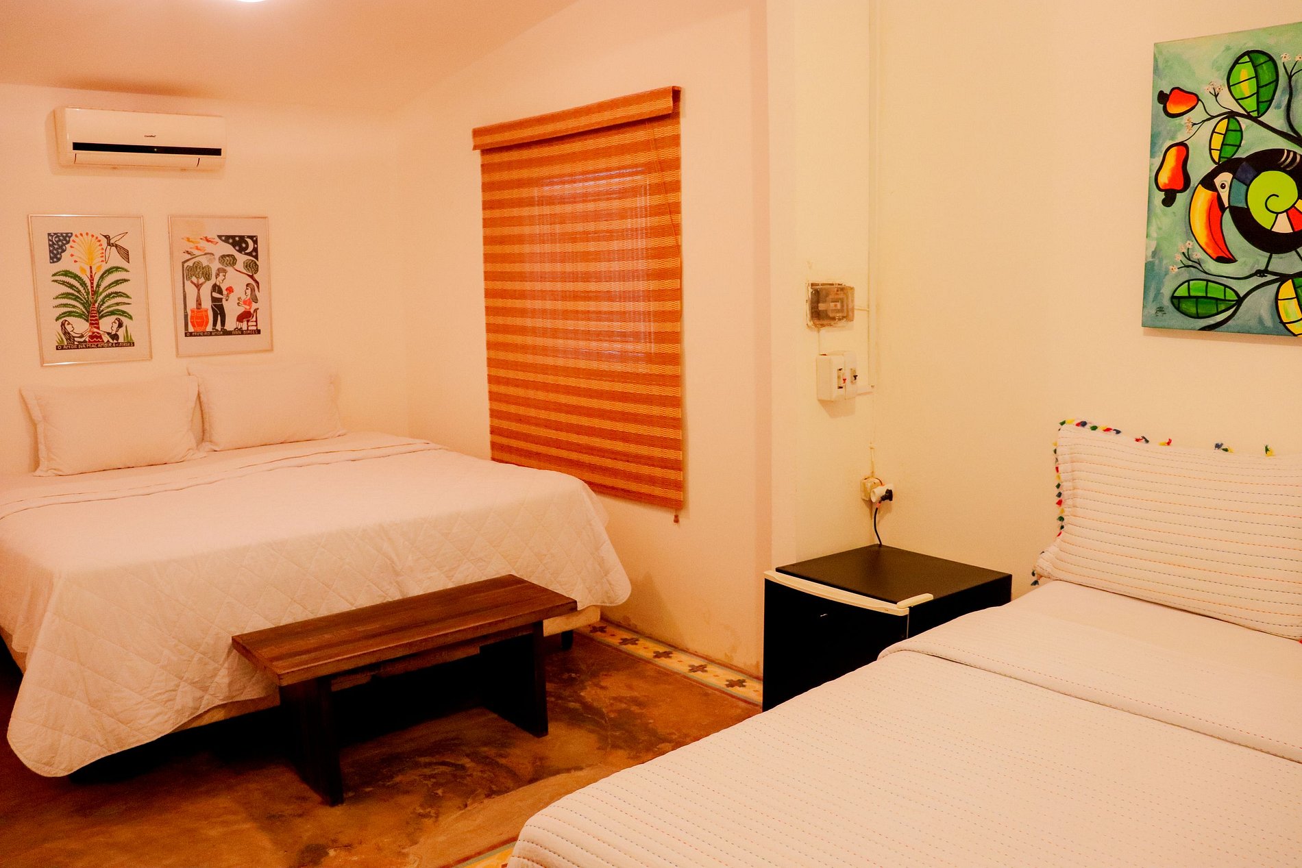 Quarto 2: 01 cama casal king size, 01 cama casal, ar-condicionado, 02 mesas de cabeceira, 01 guarda-roupas, espelho, 01 bancada de madeira, 02 abajures e decorativos;