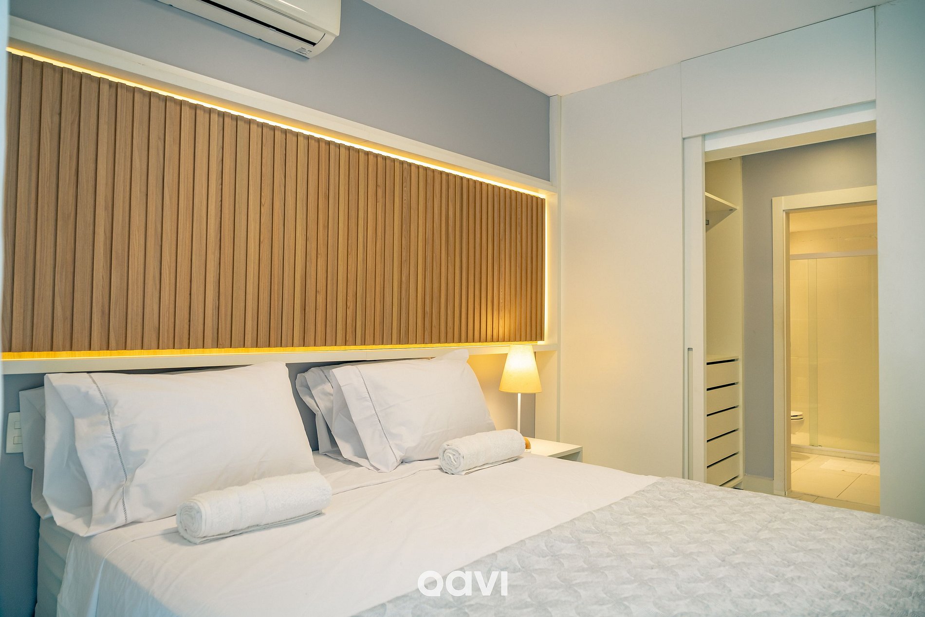 Cama de casal, ar-condicionado, cortina blackout, closet e banheiro privativo.