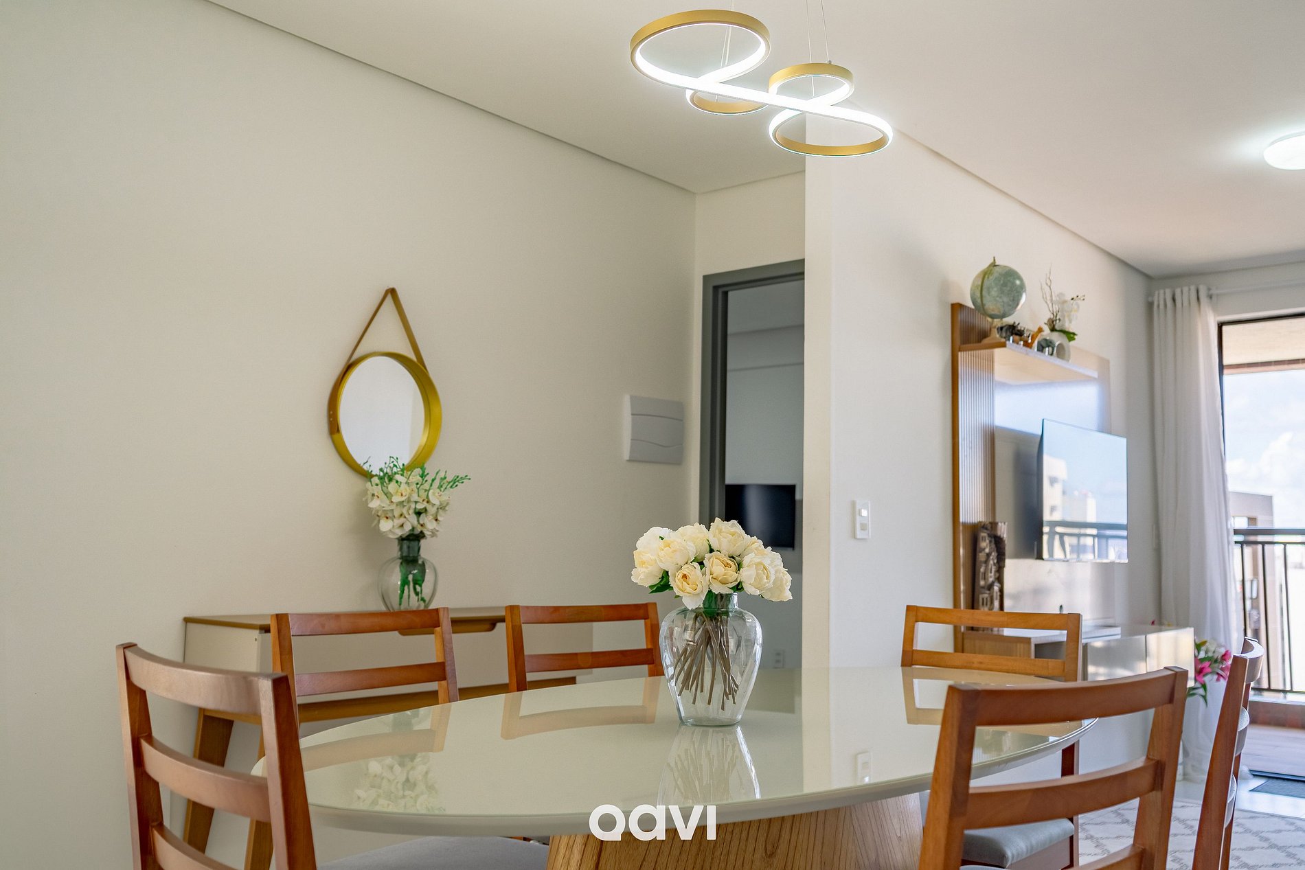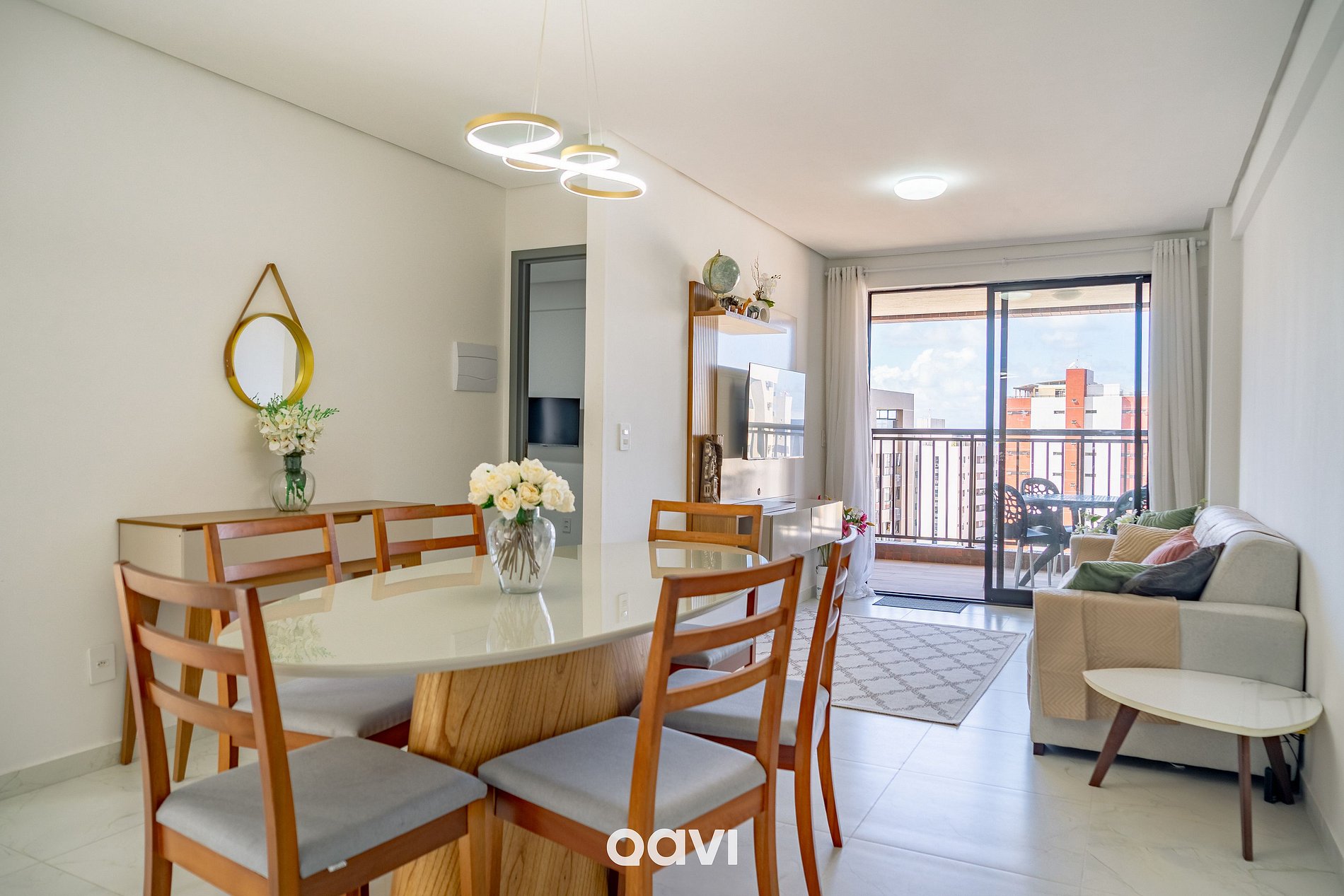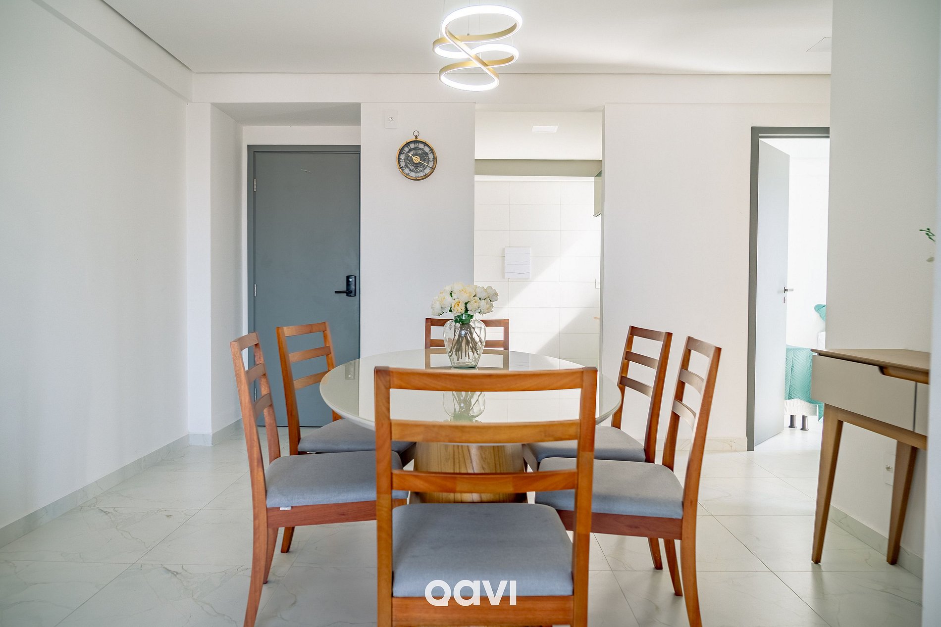 Sala: Sofá espaçoso, televisão tipo Smart-tv, mesa de jantar para 8 pessoas e acesso à varanda;