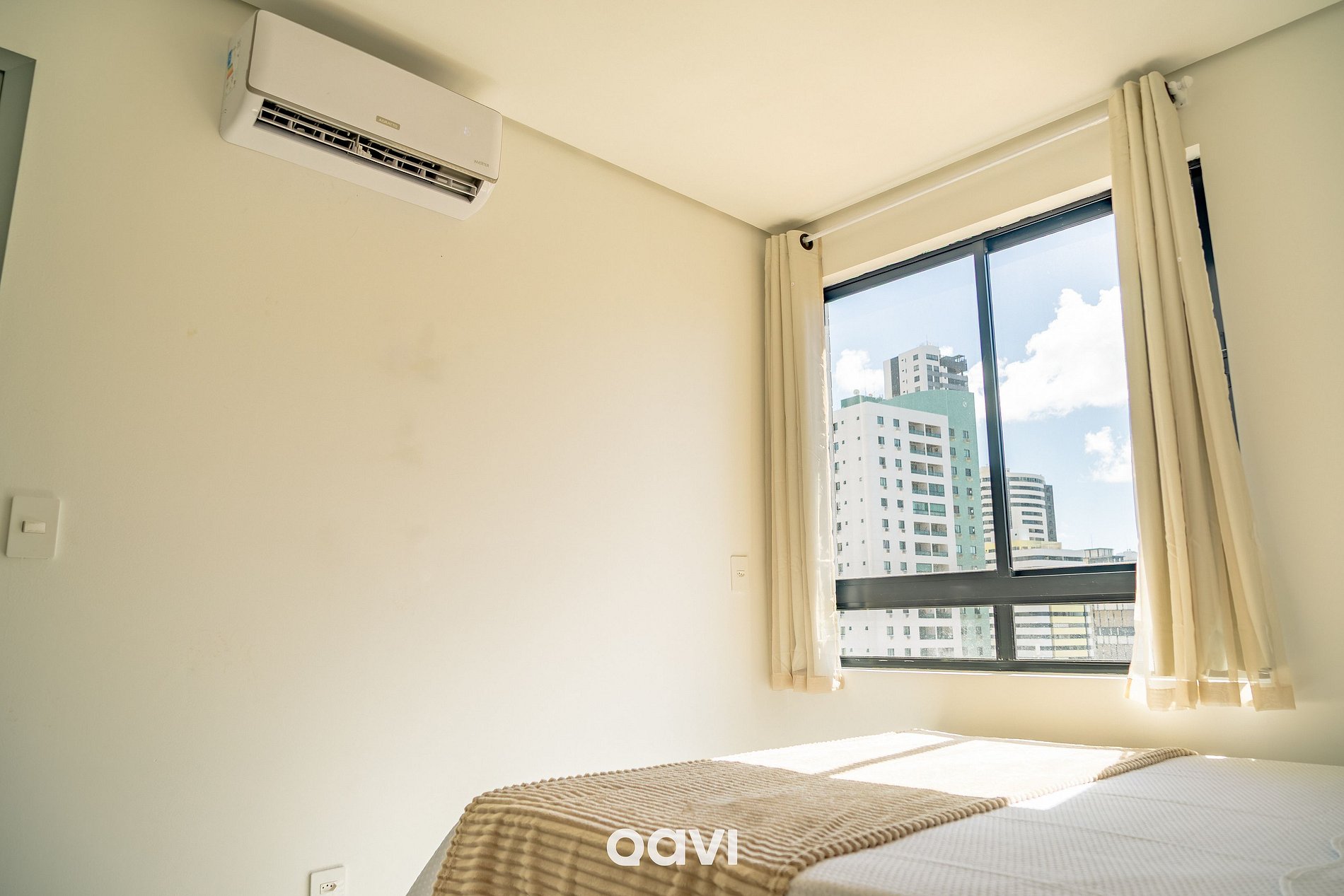 Quarto: Cama casal tipo Queen, ar-condicionado e cortina blackout;