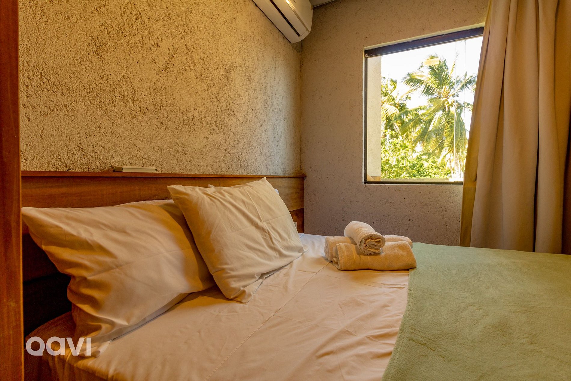 • Suíte 2: cama de casal, ar-condicionado, aparelhos decorativos e banheiro com utensílios básicos;