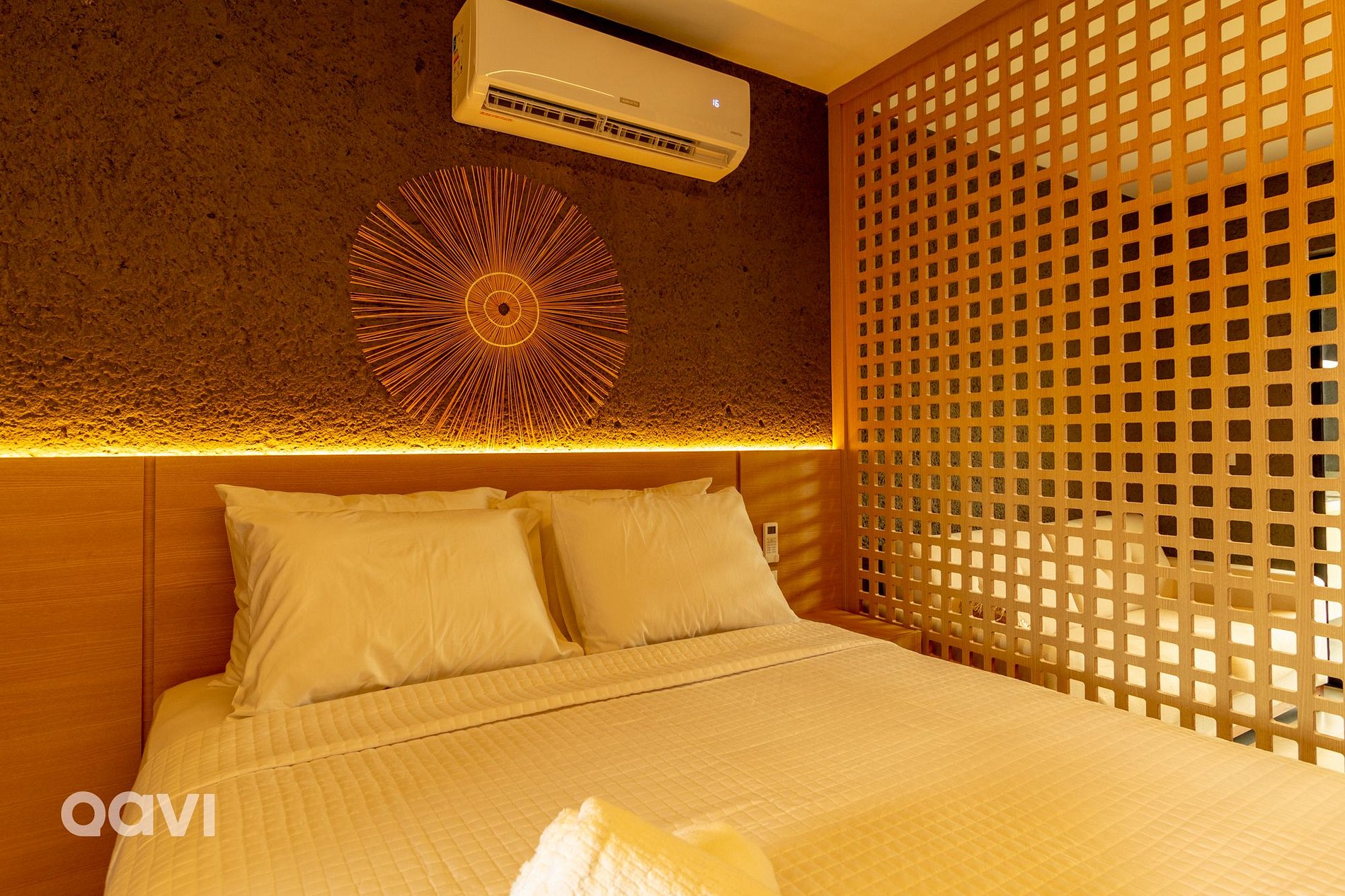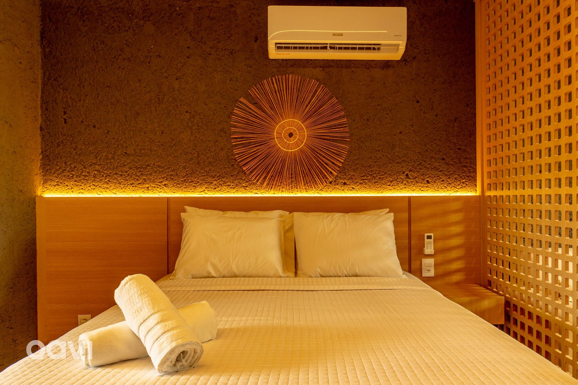 • Uma cama de casal, arr-condicionado, televisão e sofá;