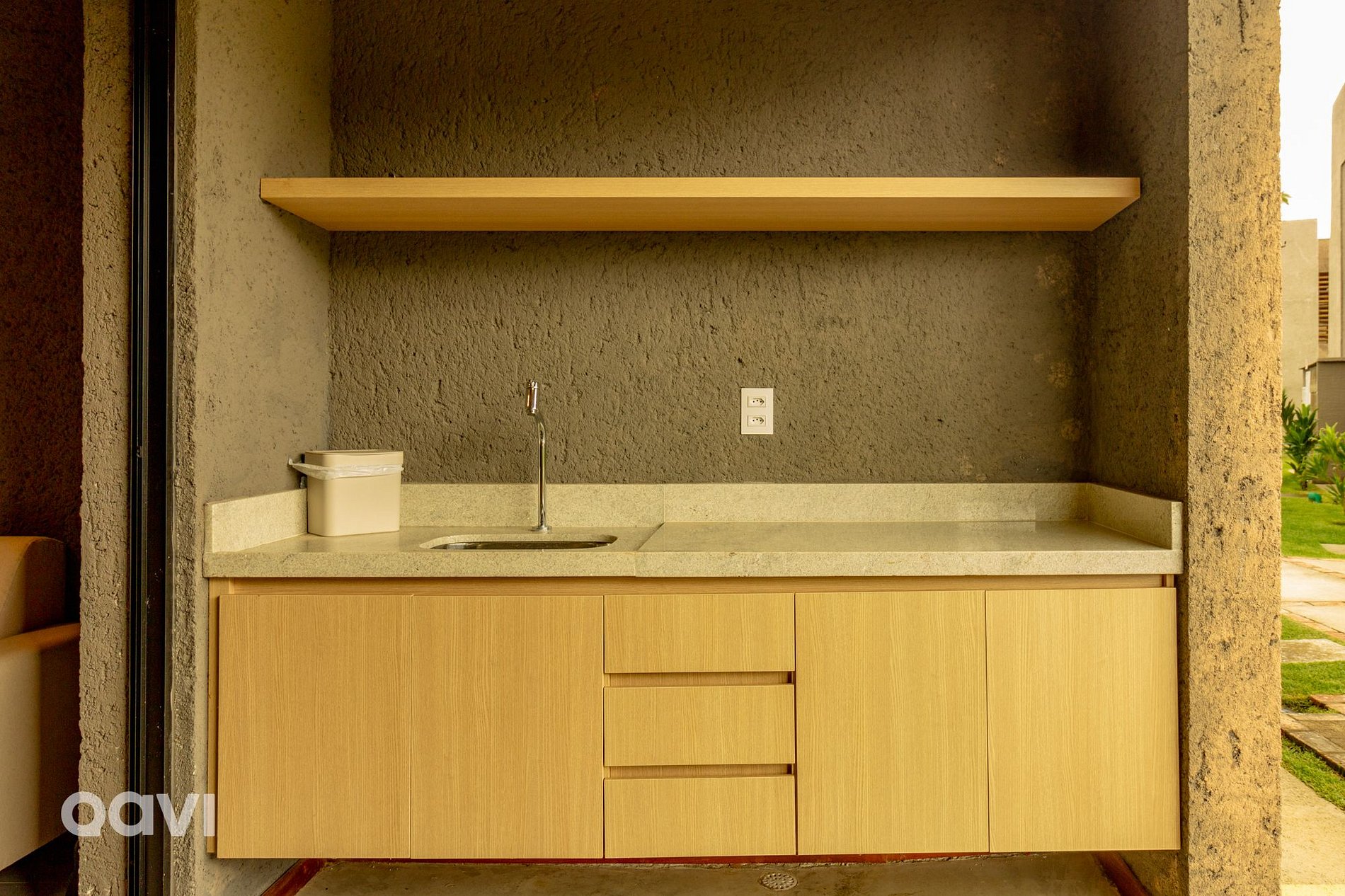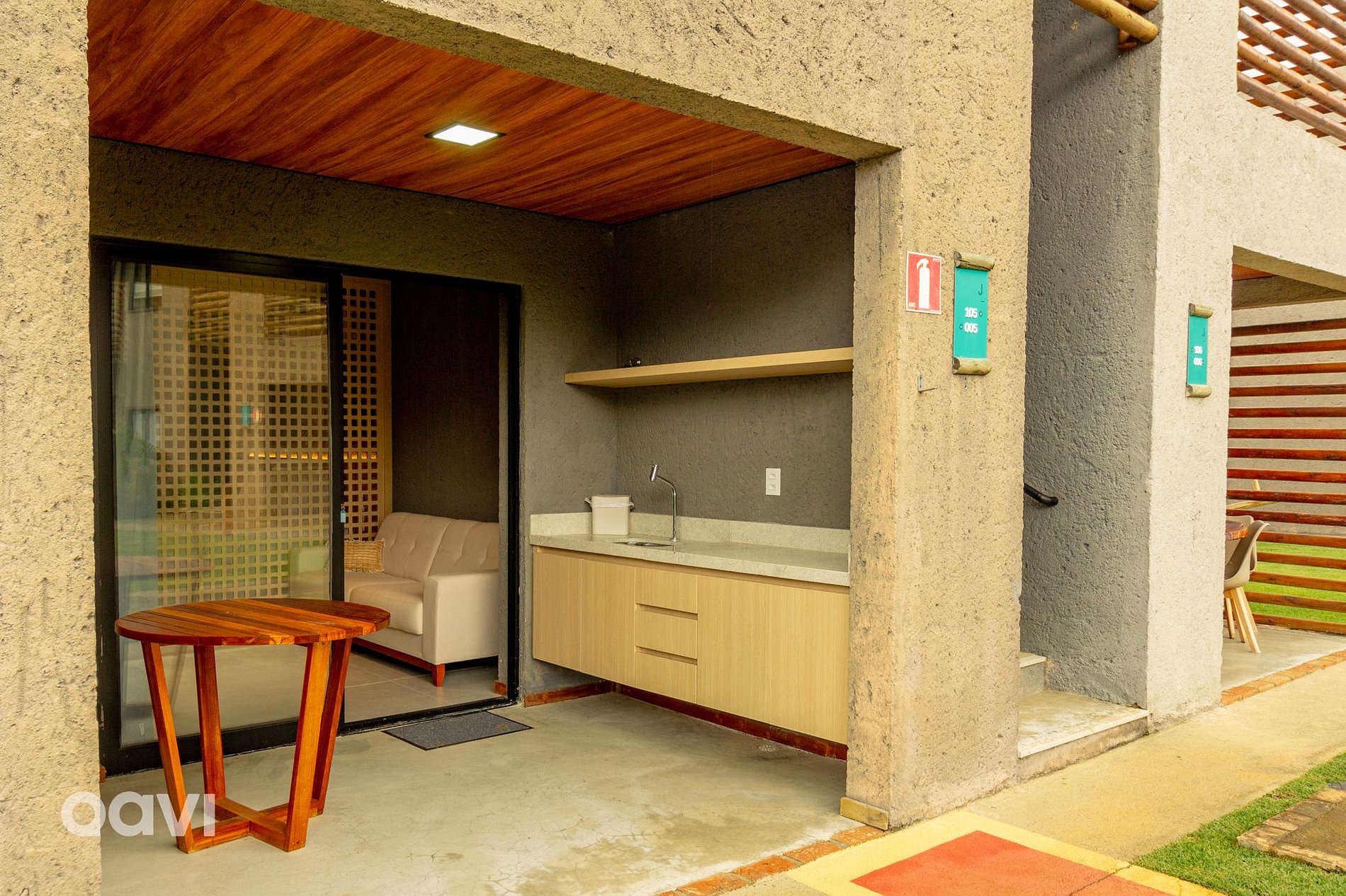 • Varanda com mesa e bancada com pia.