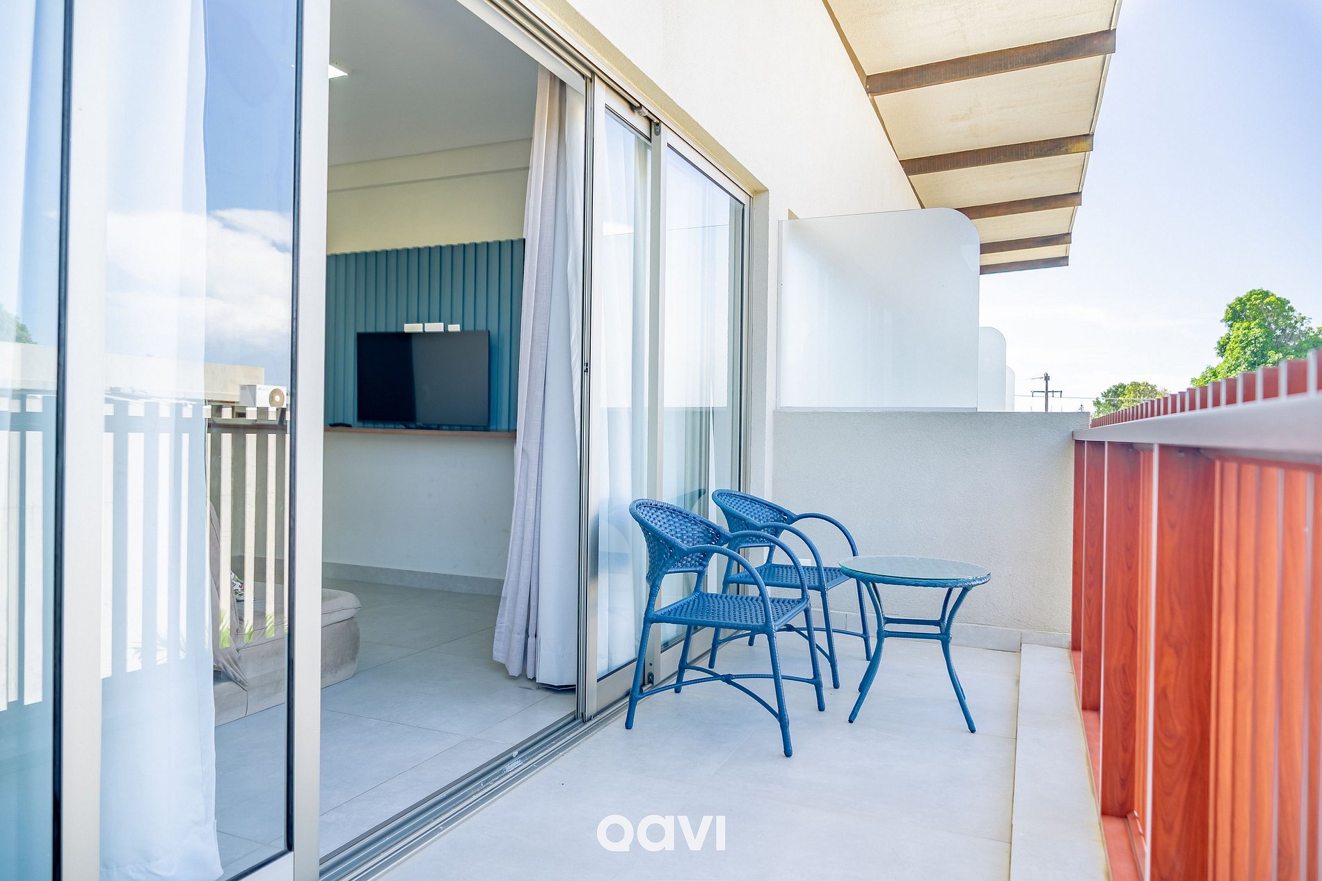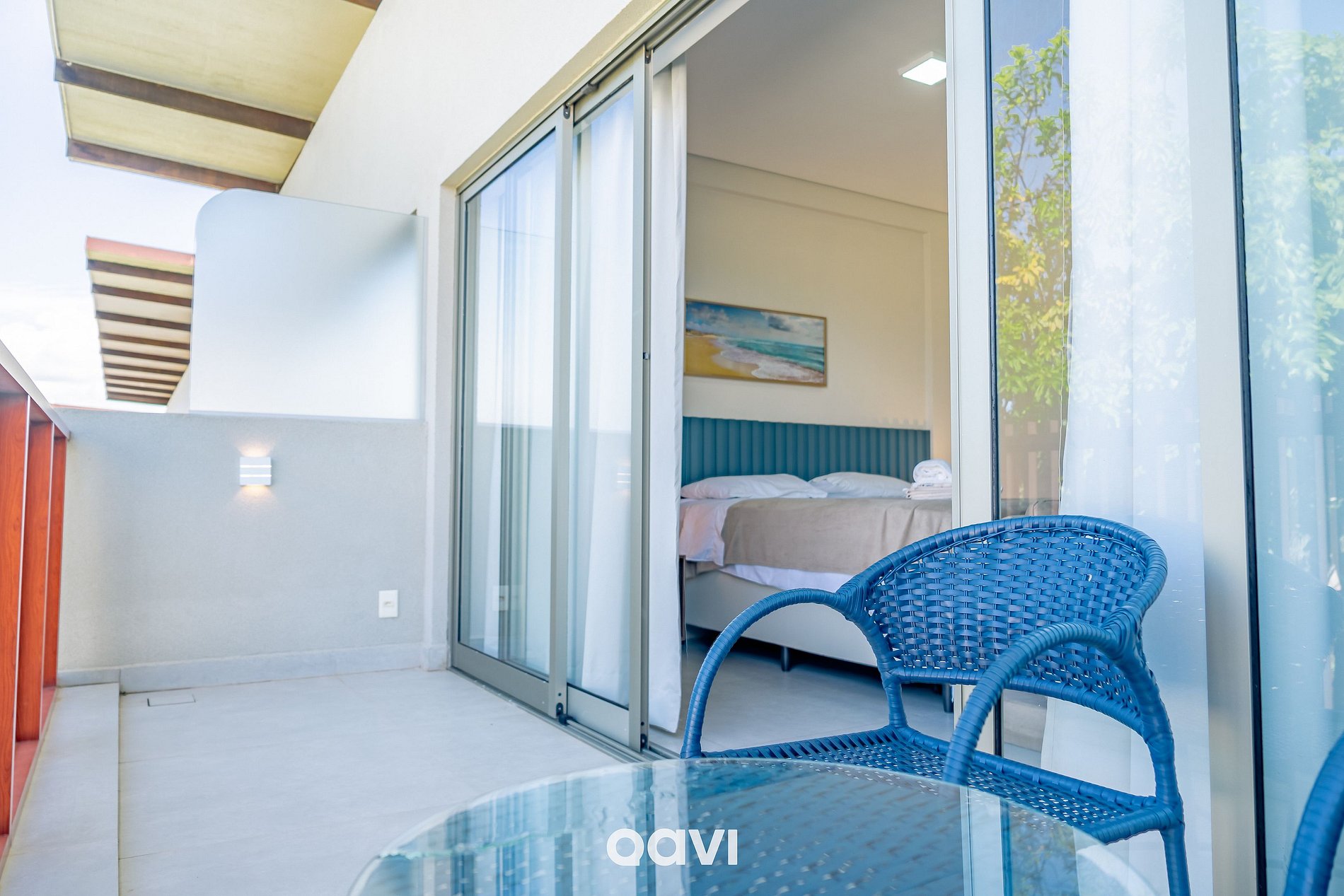 • Varanda privativa com mesa de centro e assentos.