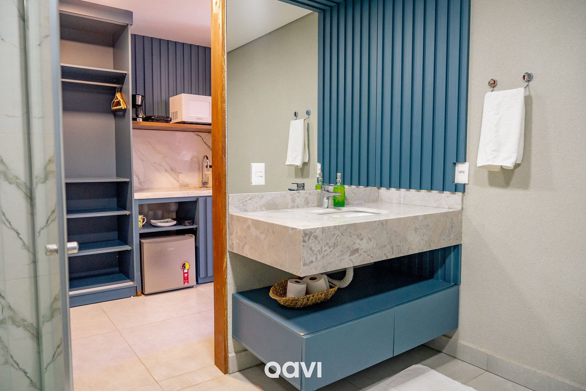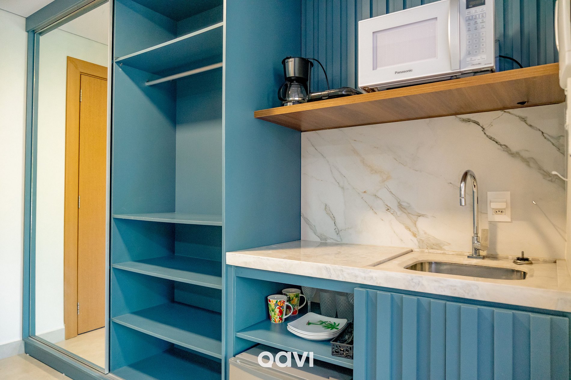 • Cozinha Gourmet: Frigobar + micro-ondas, torradeira, Cafeteira elétrica e kit completo de utensílios (talheres, pratos e copos, cutelaria);