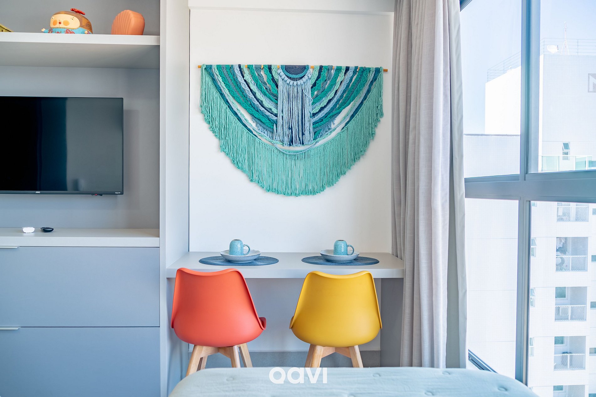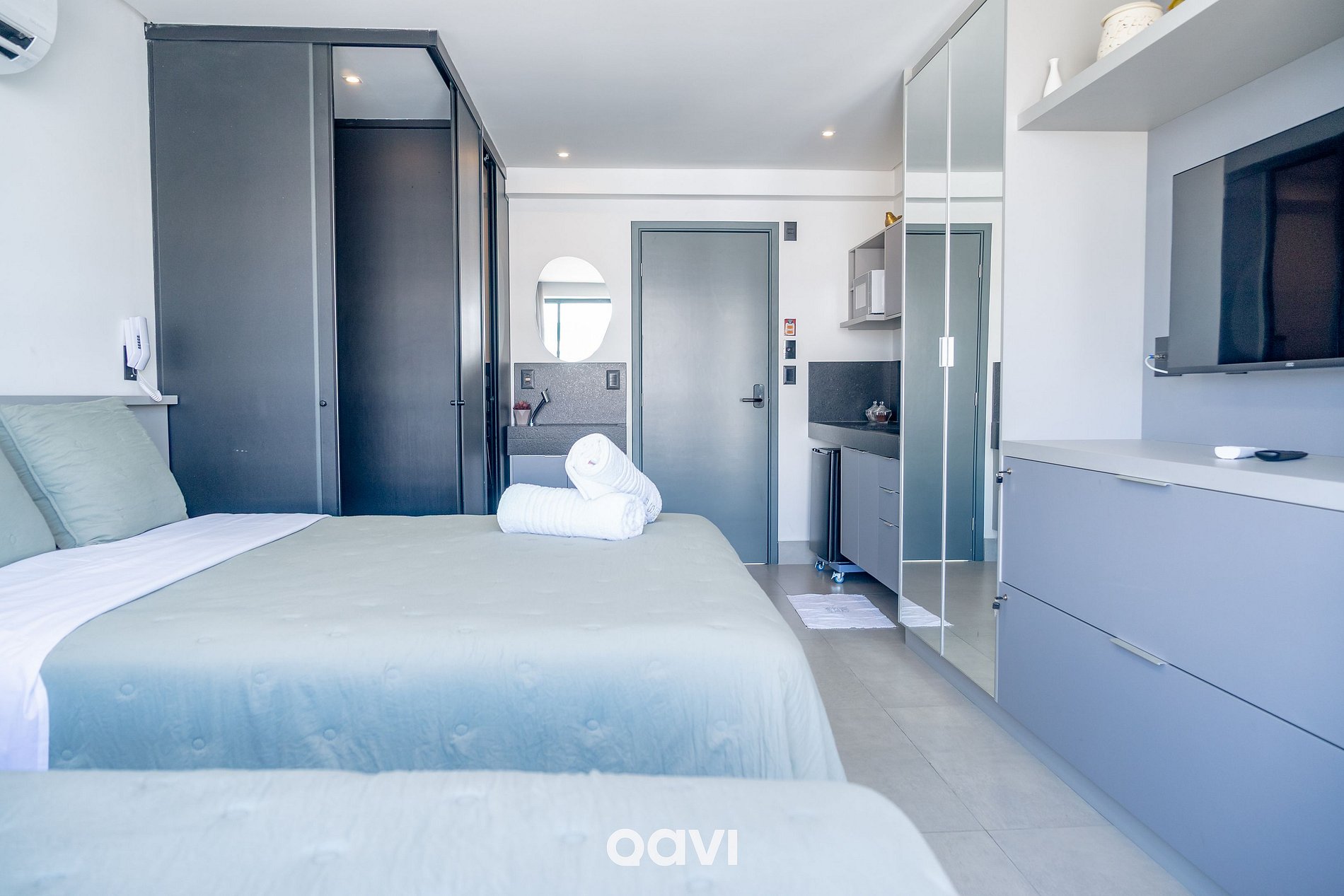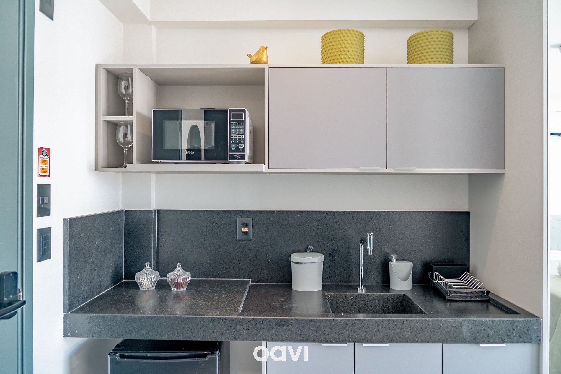 O apartamento que tem um finíssimo acabamento, é uma suíte integrada, com cozinha e área de estudo/trabalho e Wi-fi, sendo todo o ambiente planejado para proporcionar conforto e praticidade aos hóspedes.