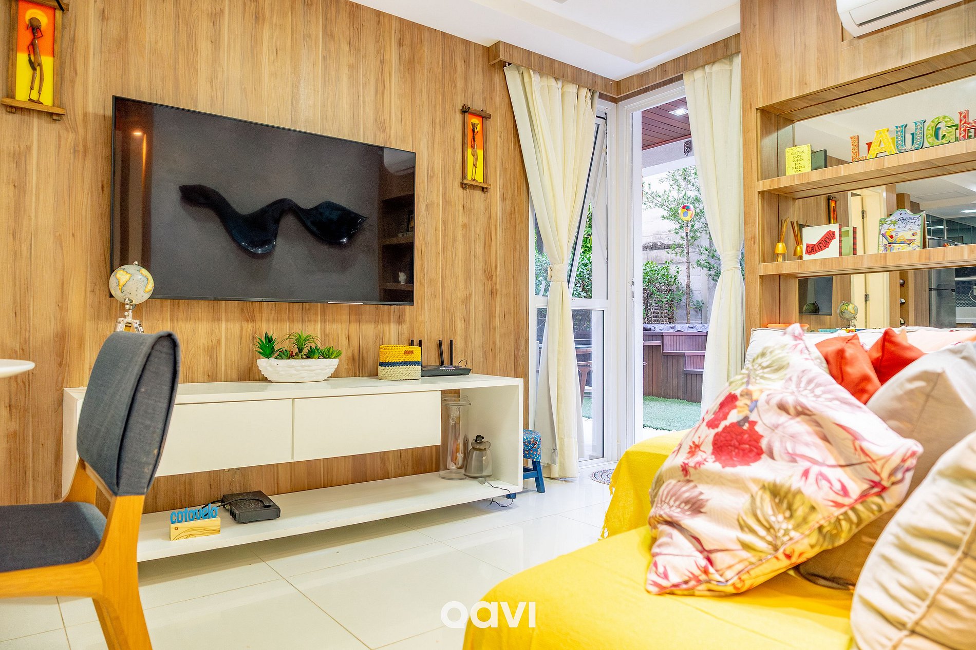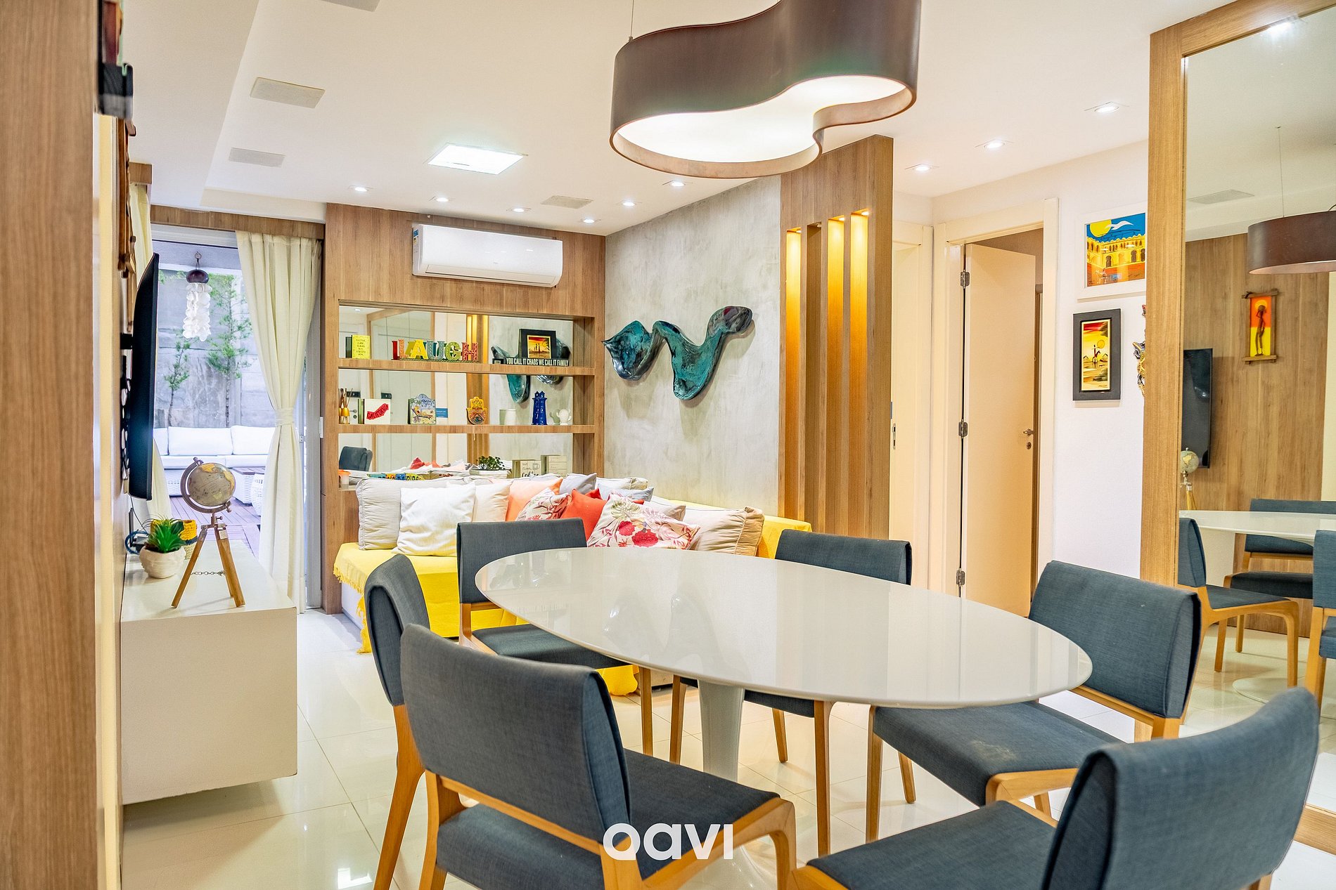 Sofá espaçoso, TV, adega e acesso direto à varanda.