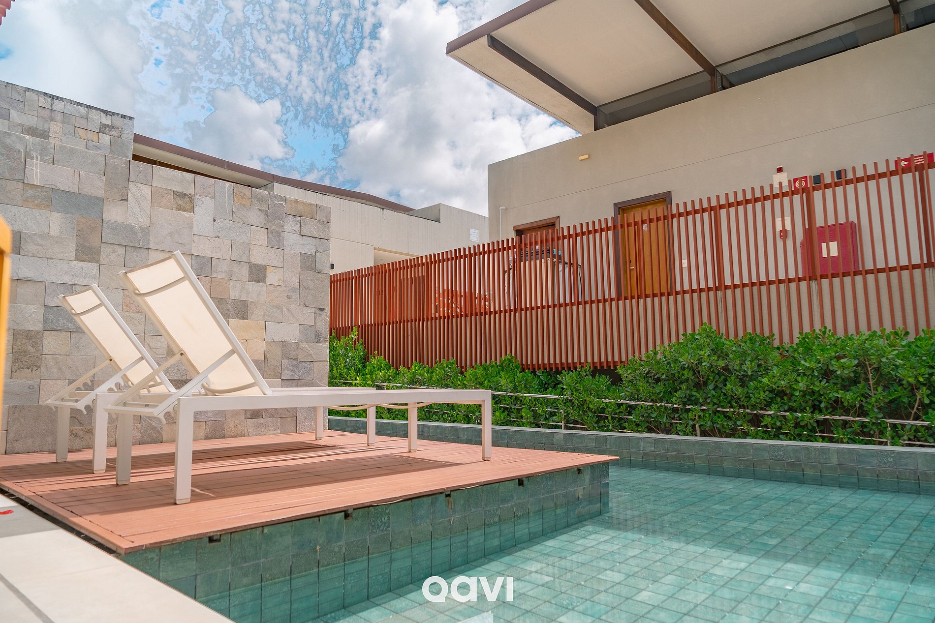 Deck molhado: No exterior da suíte contamos com espreguiçadeiras e mesa com cadeiras.