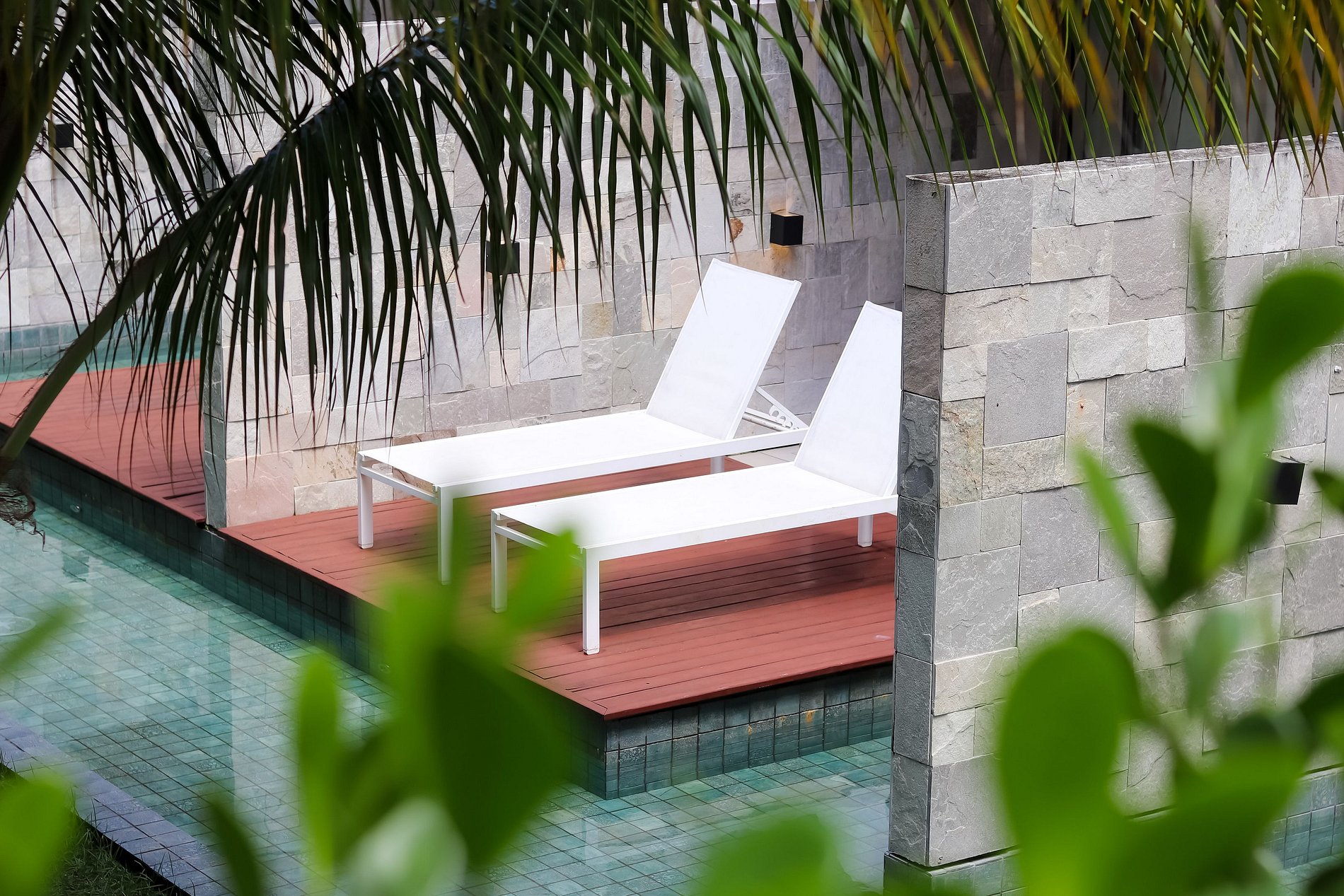 Deck molhado: No exterior da suíte contamos com espreguiçadeiras e mesa com cadeiras.