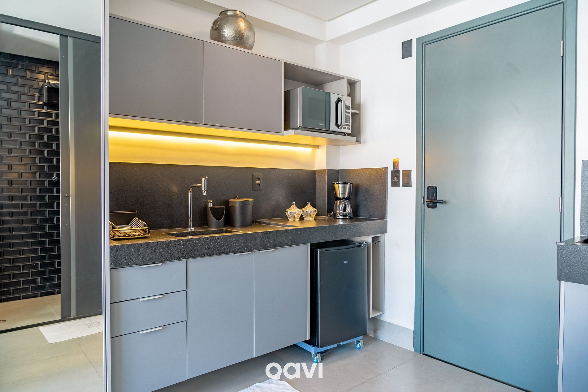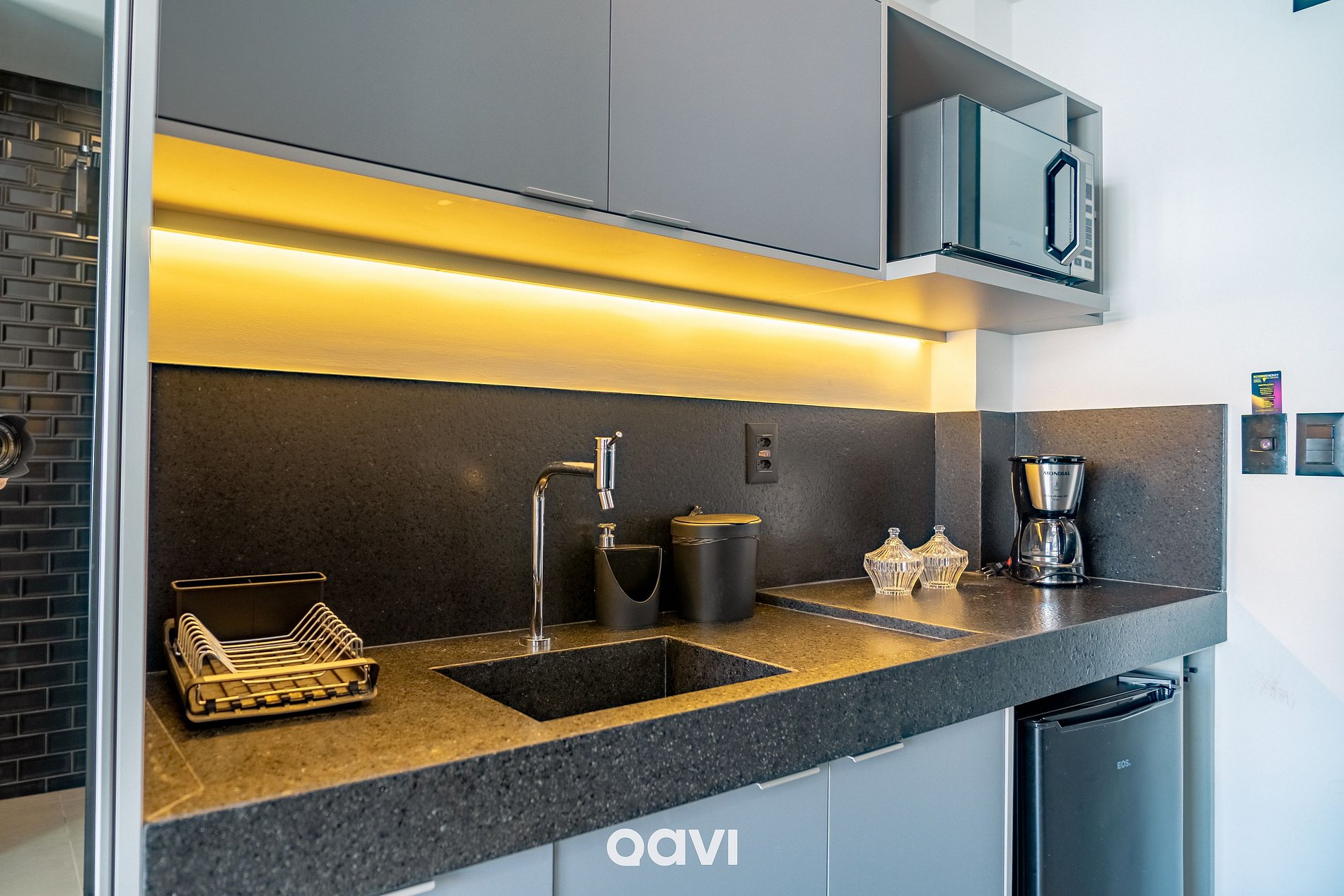 - Cozinha: Micro-ondas e frigobar, Air fryer, sanduicheira, liquidificador, mixer, cafeteira elétrica e utensílios básicos (talheres, copos e taças);