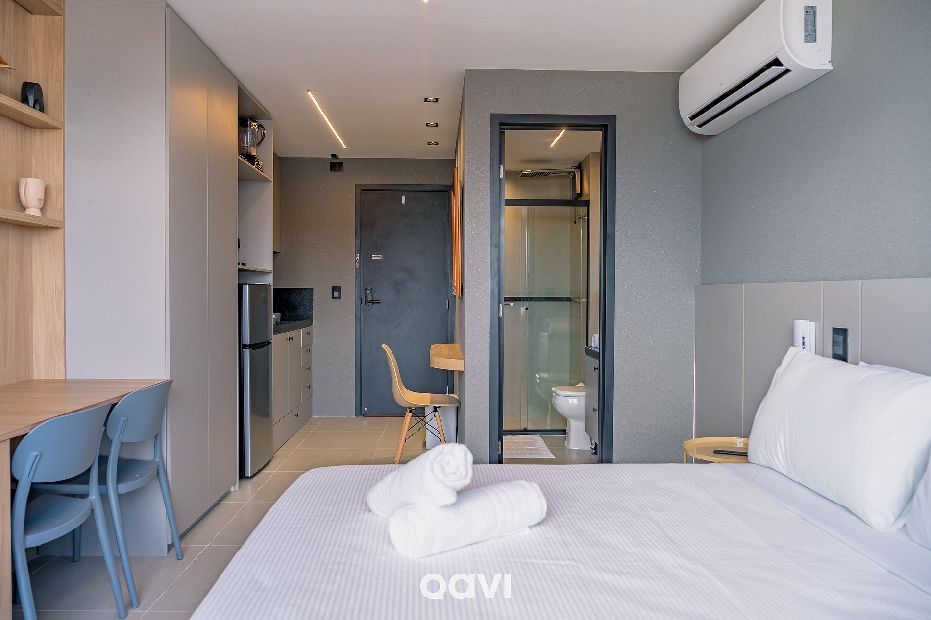 O studio possui um finíssimo acabamento, é uma suíte integrada, com cozinha, mesa para refeições, 2 cadeiras e Wi-fi, sendo todo o ambiente planejado para proporcionar conforto e praticidade aos hóspedes.