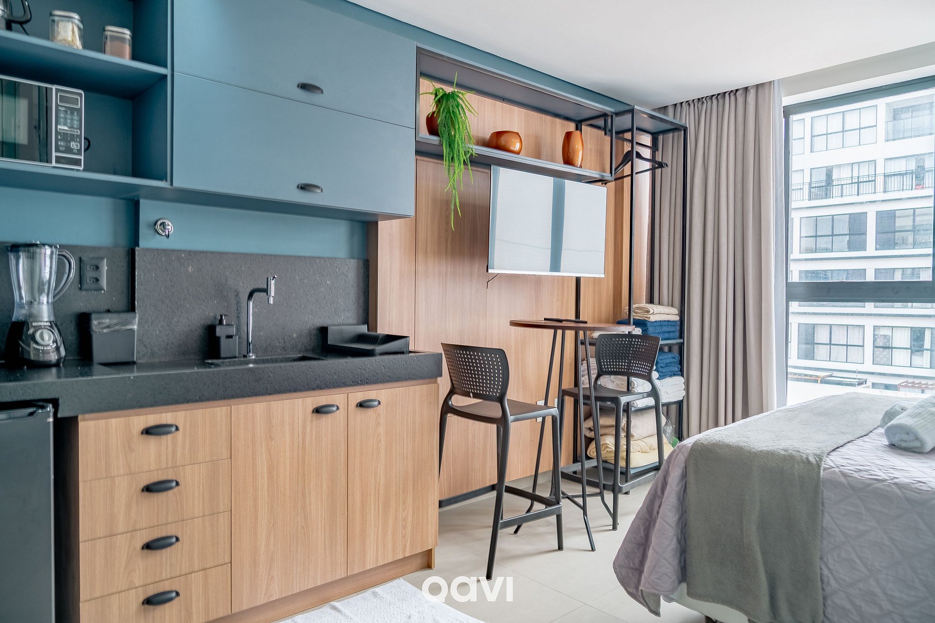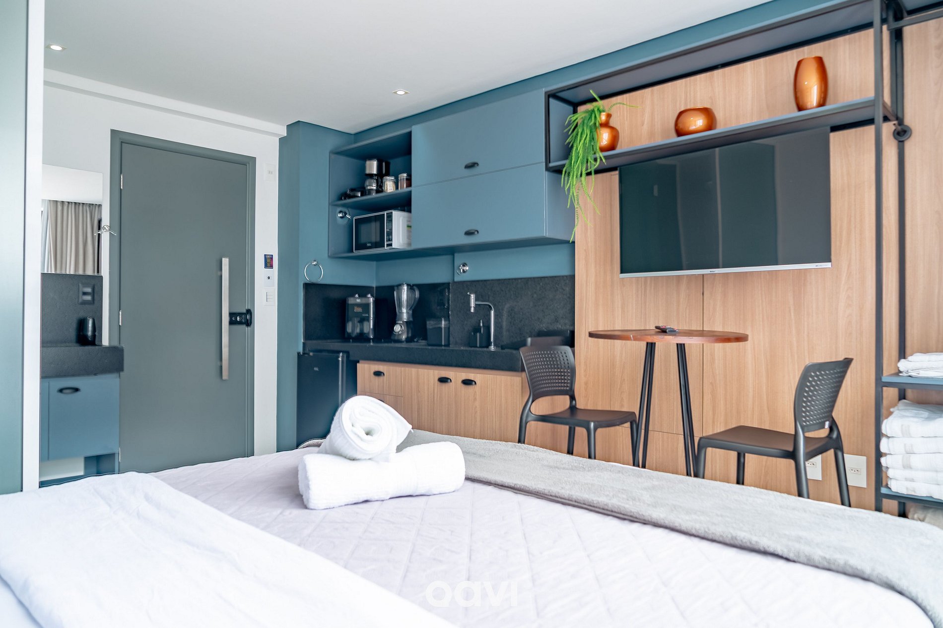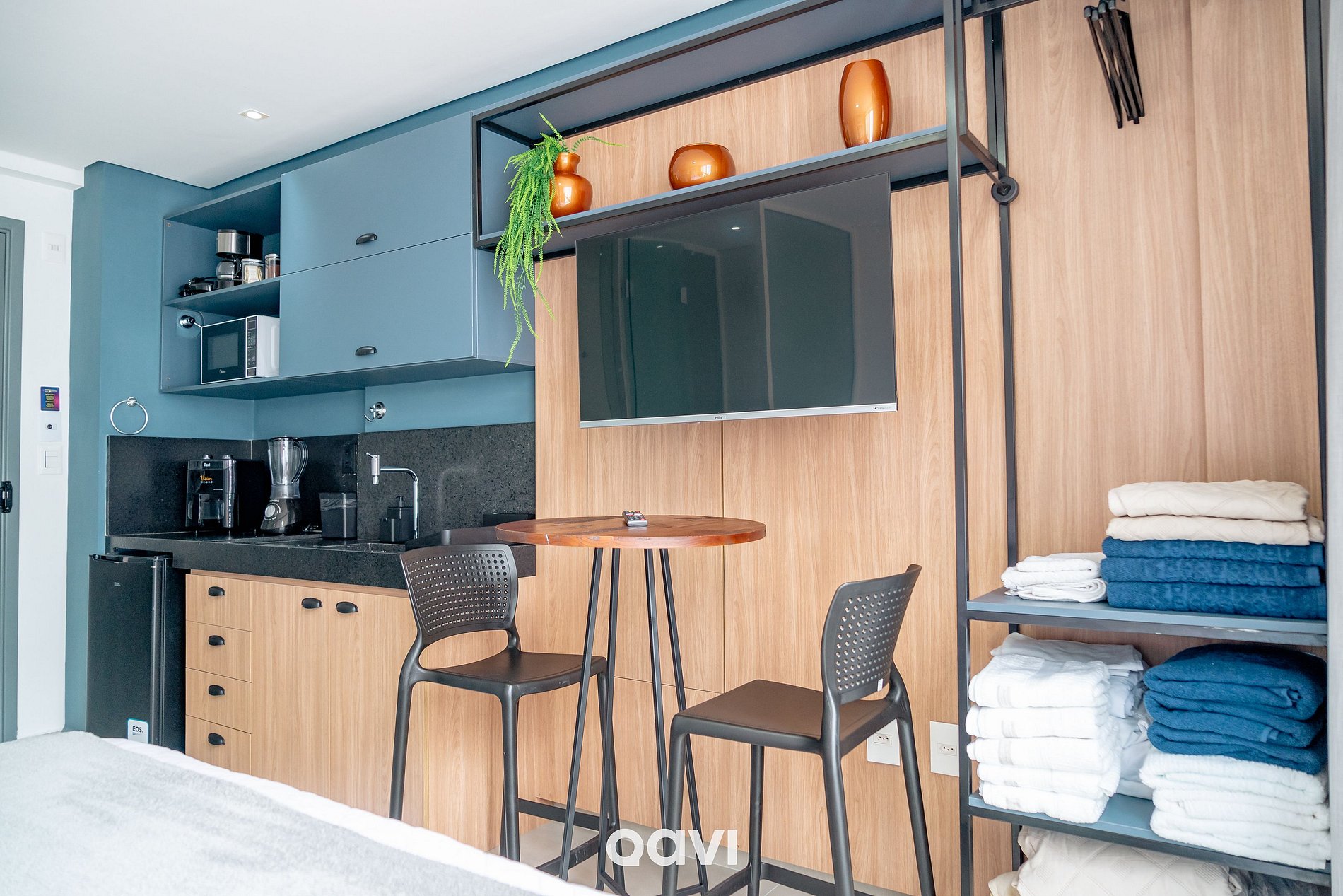 O apartamento que tem um finíssimo acabamento, é uma suíte integrada, com cozinha e área de estudo/trabalho e Wi-fi, sendo todo o ambiente planejado para proporcionar conforto e praticidade aos hóspedes.