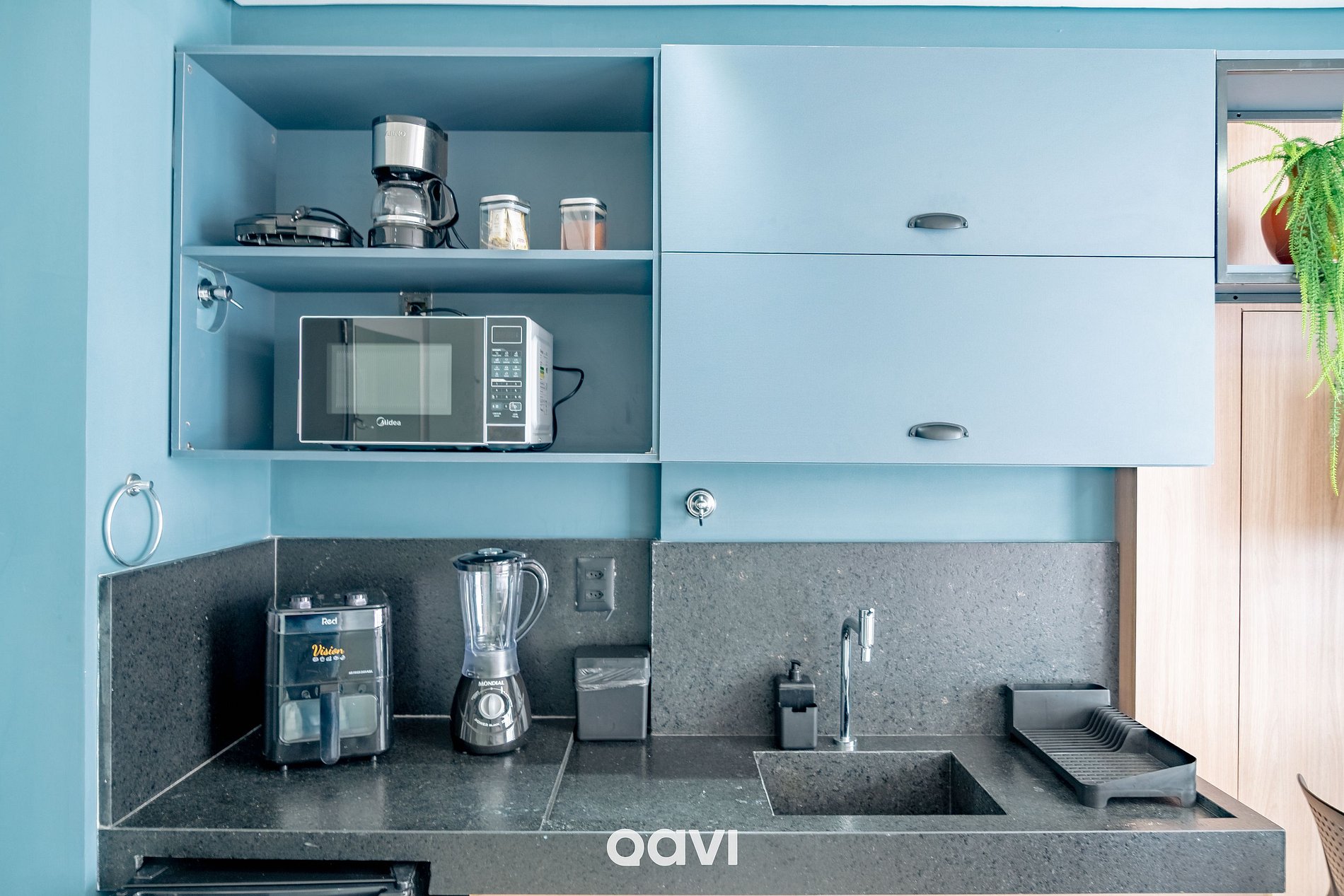 - Cozinha: Micro-ondas e frigobar, máquina de café e utensílios básicos (panelas, copos e taças);