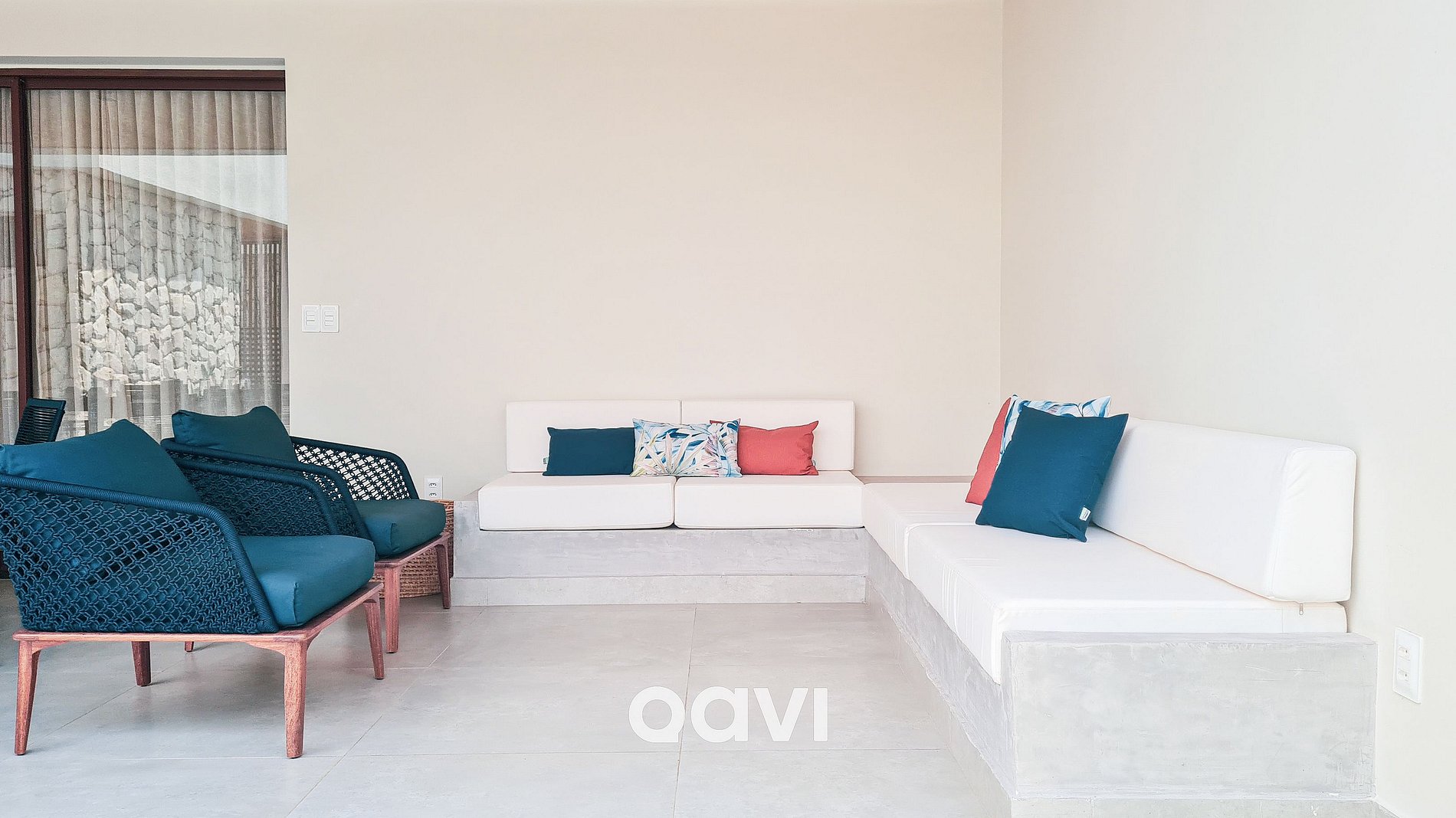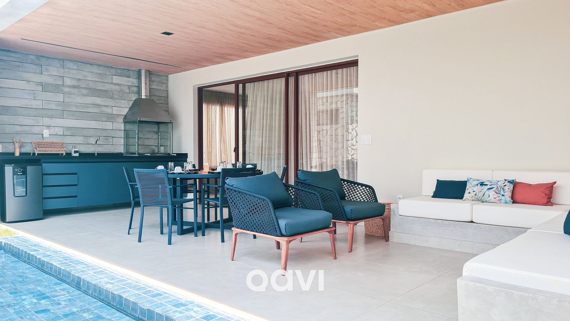Área de lazer: Se trata de um ambiente amplo e moderno com uma linda piscina totalmente privativa, perfeito para reunir familiares e amigos . O espaço é composto por uma mesa redonda de 8 lugares; sofá amplo; duas poltronas e confortáveis colchões ao lado da piscina, ideal para relaxar. Possui também uma churrasqueira, na sombra, ao lado de uma bancada de mármore com pia para facilitar no preparo dos alimentos. Para sua comodidade, nos armários e gavetas, abaixo da churrasqueira, é possível achar kit para churrasco com talheres, pegadores e facas para corte, e ainda há uma cervejeira para não precisar se deslocar muito para pegar sua bebida.