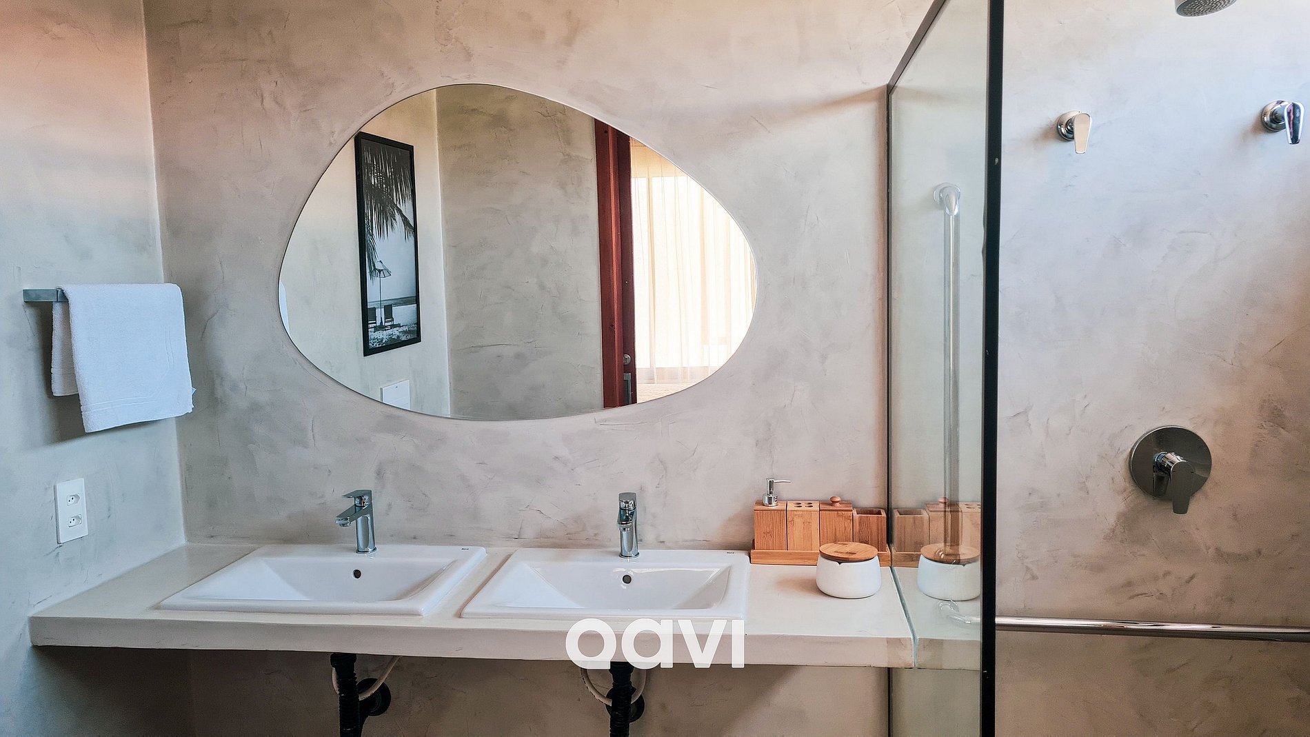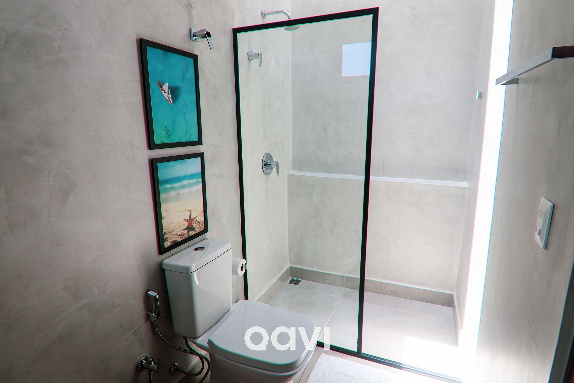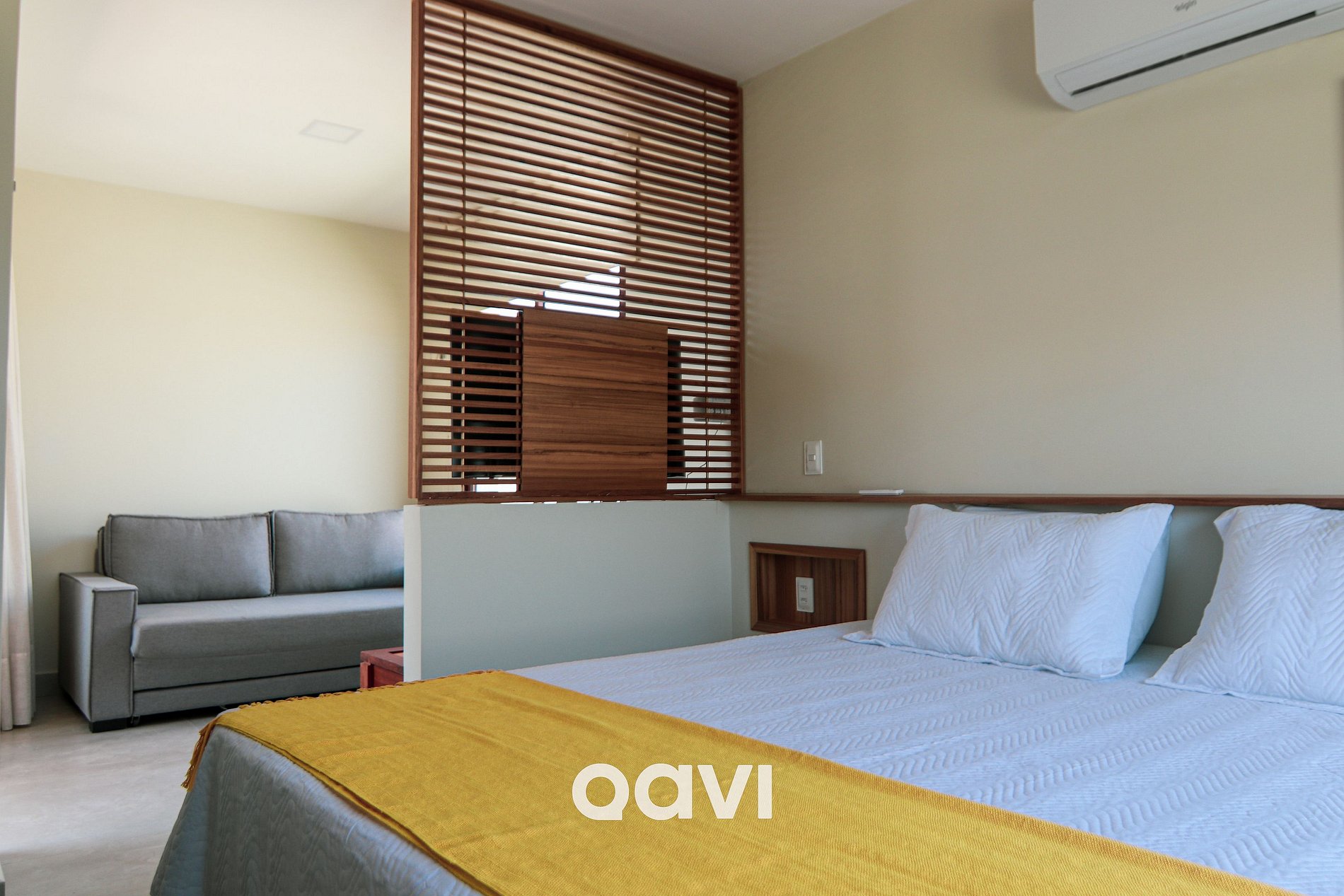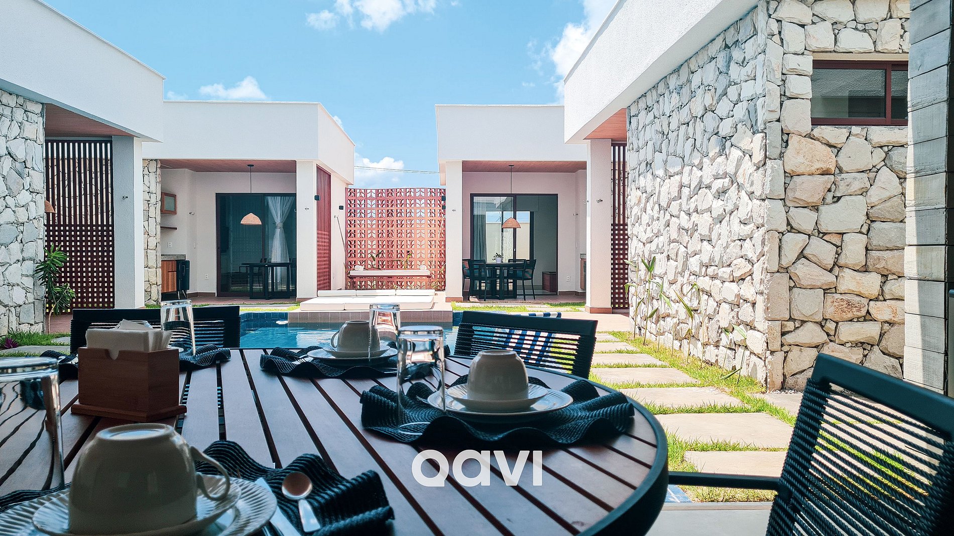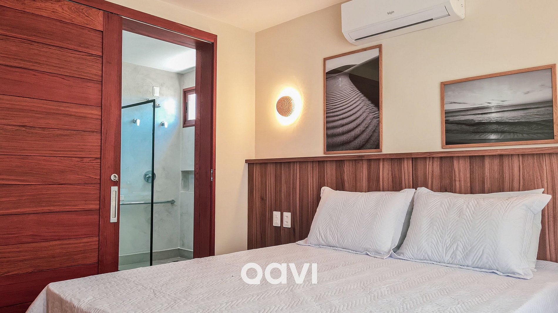Suítes externas: 4 confortáveis suítes, totalmente idênticas, compostas, cada uma delas, da seguinte forma: uma pequena varanda em frente a piscina com moderna mesa de 4 lugares; bancada em mármore com pia; armários e gavetas com conjunto de talheres, além de um frigobar. Já a parte interna é composta por uma Cama king, com uma cama de solteiro acoplada; confortável sofá cama para duas pessoas; TV com função smart; ar-condicionado; baú de madeira; guarda roupas; aparador; abajur; tomadas ao lado da cama; cortina blackout e ar condicionado. Banheiro aconchegante pias e torneiras modernas; espelho; porta sabonetes e escovas; cesto de palha para guardar itens de higiene; ducha higiênica; porta toalhas e chuveiro aquecido via energia solar.