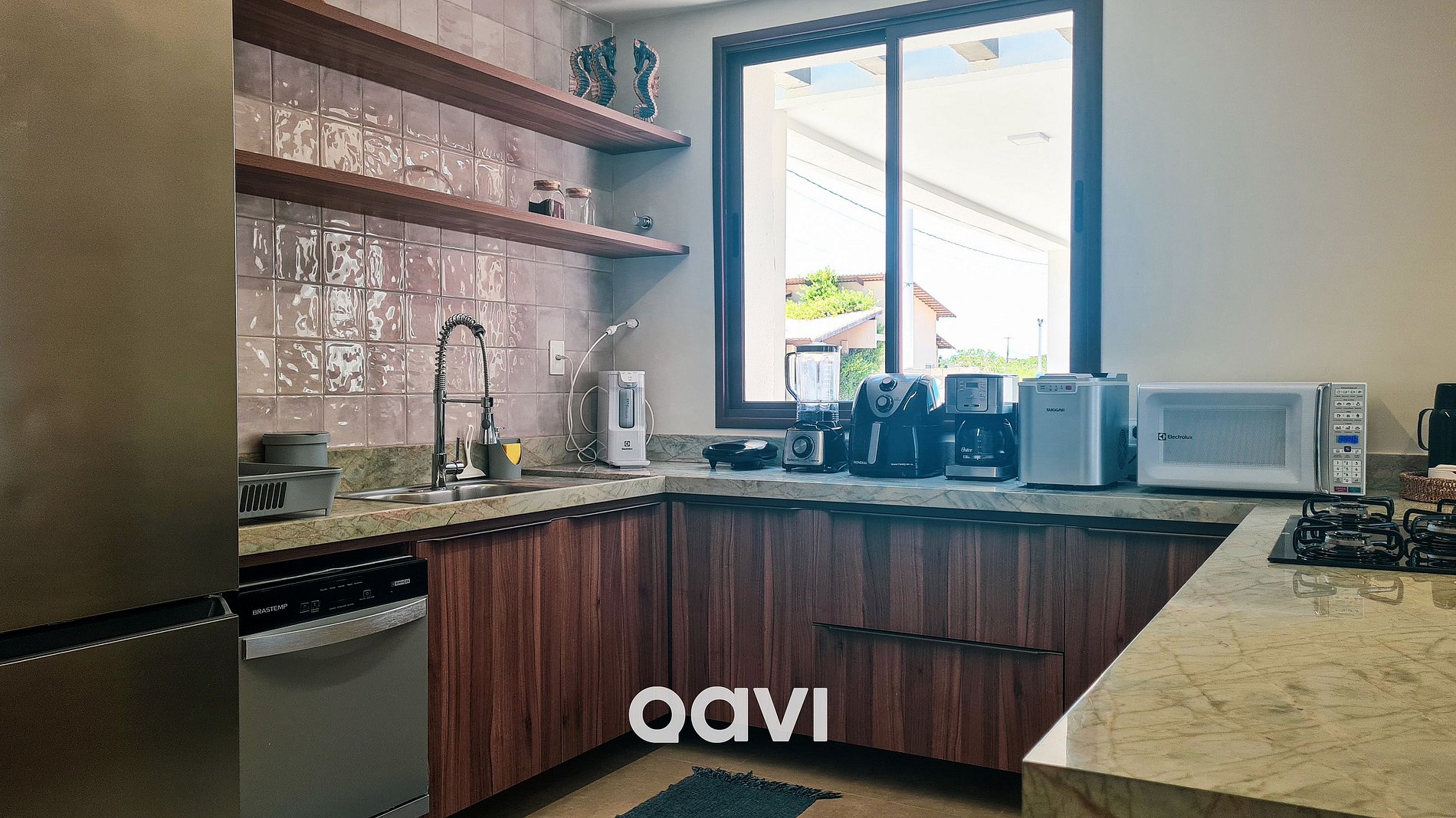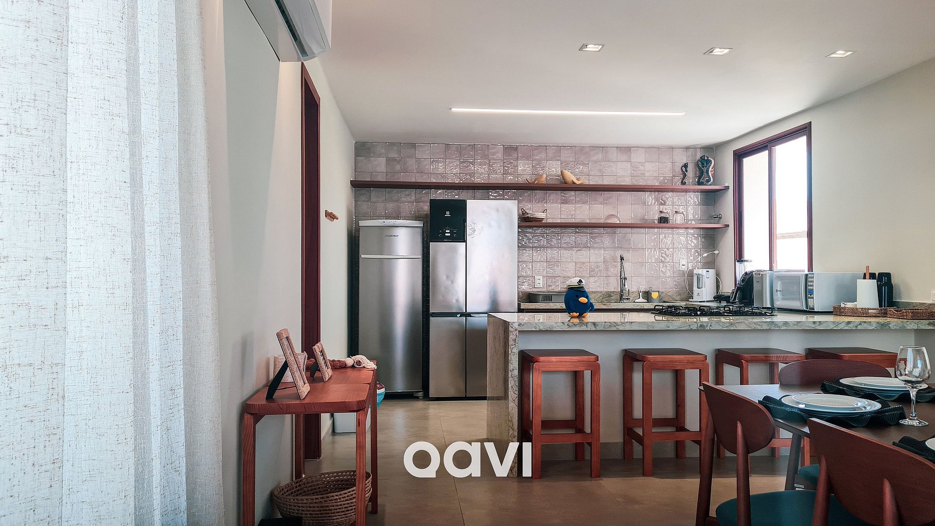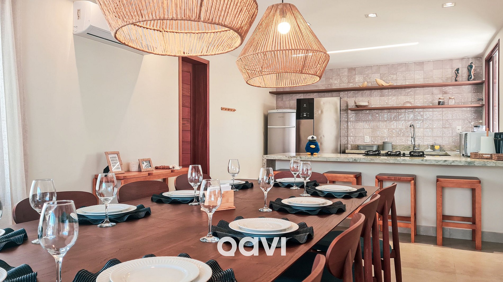 Sala com cozinha acoplada: Vasto e aconchegante espaço, totalmente climatizado por dois ares-condicionados, composto por um grande sofá retrátil; duas poltronas; duas banquetas baixas; TV com função smart sob um lindo hack; moderna mesa de jantar com 10 lugares; aparador; extensa bancada em mármore com 4 banquetas altas e alguns itens de cozinha essenciais para sua estadia, como uma pia com moderna torneira gourmet; fogão cooktop 5 bocas; forno elétrico; geladeira duas portas; freezer vertical; máquina lava-louças; filtro de água; micro-ondas; airfryer; liquidificador; torradeira elétrica, além de itens básicos, como conjunto completo de panelas; copos para água; cerveja e whisky; taças para vinho e gin, além de conjunto completo de talheres.
