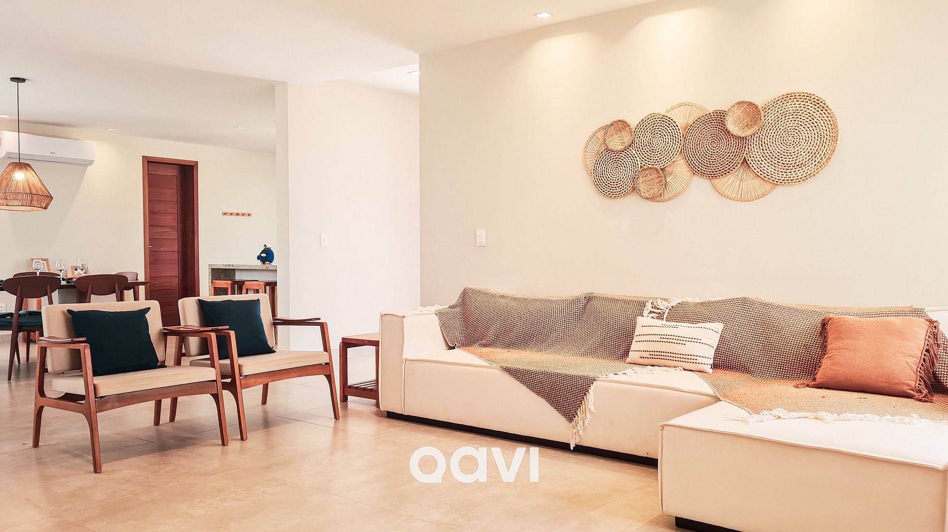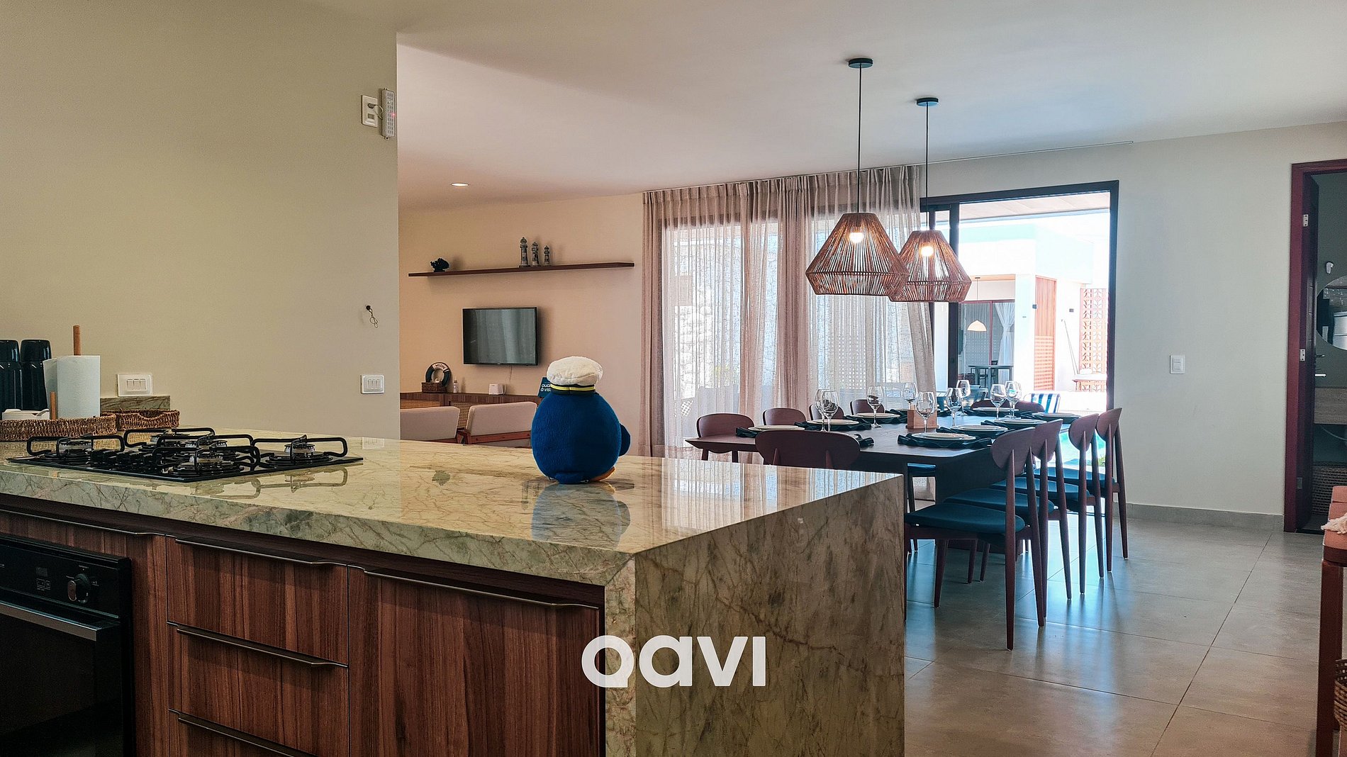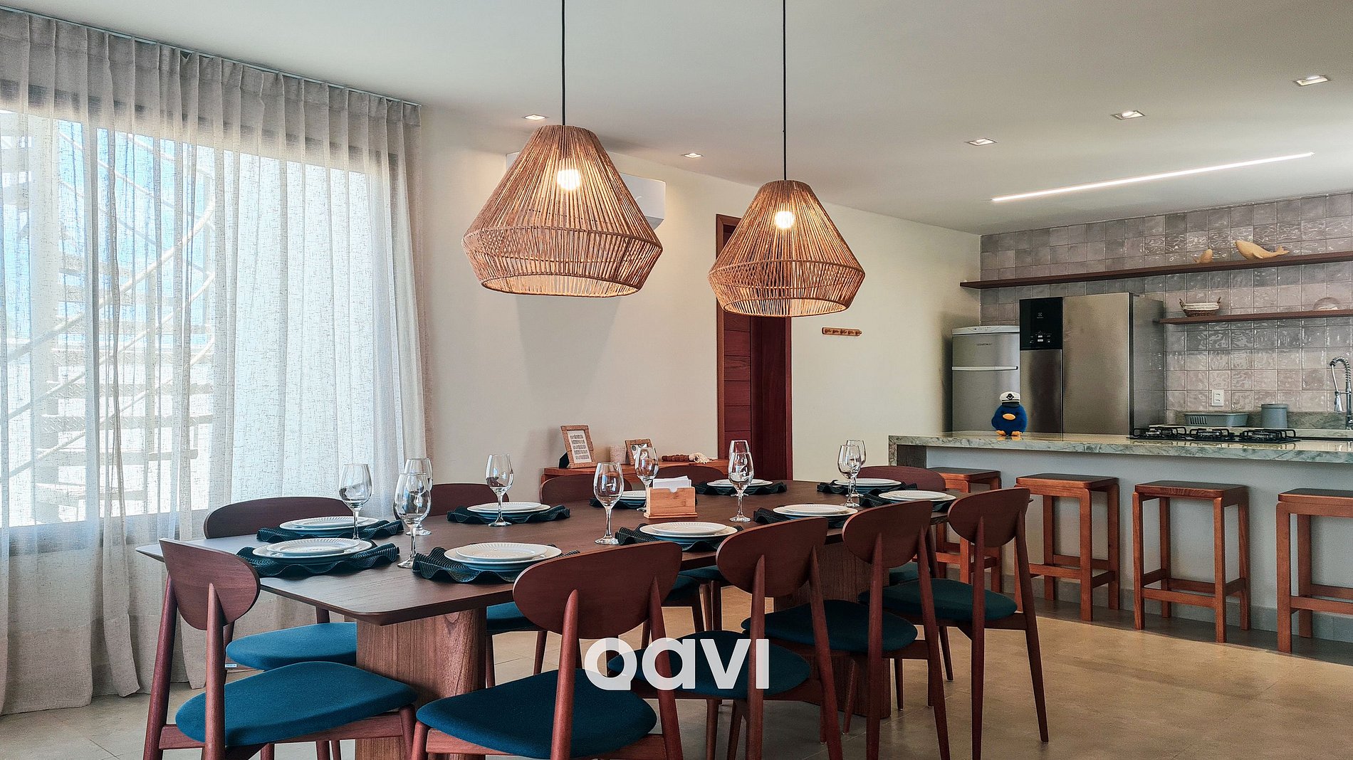 Sala com cozinha acoplada: Vasto e aconchegante espaço, totalmente climatizado por dois ares-condicionados, composto por um grande sofá retrátil; duas poltronas; duas banquetas baixas; TV com função smart sob um lindo hack; moderna mesa de jantar com 10 lugares; aparador; extensa bancada em mármore com 4 banquetas altas e alguns itens de cozinha essenciais para sua estadia, como uma pia com moderna torneira gourmet; fogão cooktop 5 bocas; forno elétrico; geladeira duas portas; freezer vertical; máquina lava-louças; filtro de água; micro-ondas; airfryer; liquidificador; torradeira elétrica, além de itens básicos, como conjunto completo de panelas; copos para água; cerveja e whisky; taças para vinho e gin, além de conjunto completo de talheres.