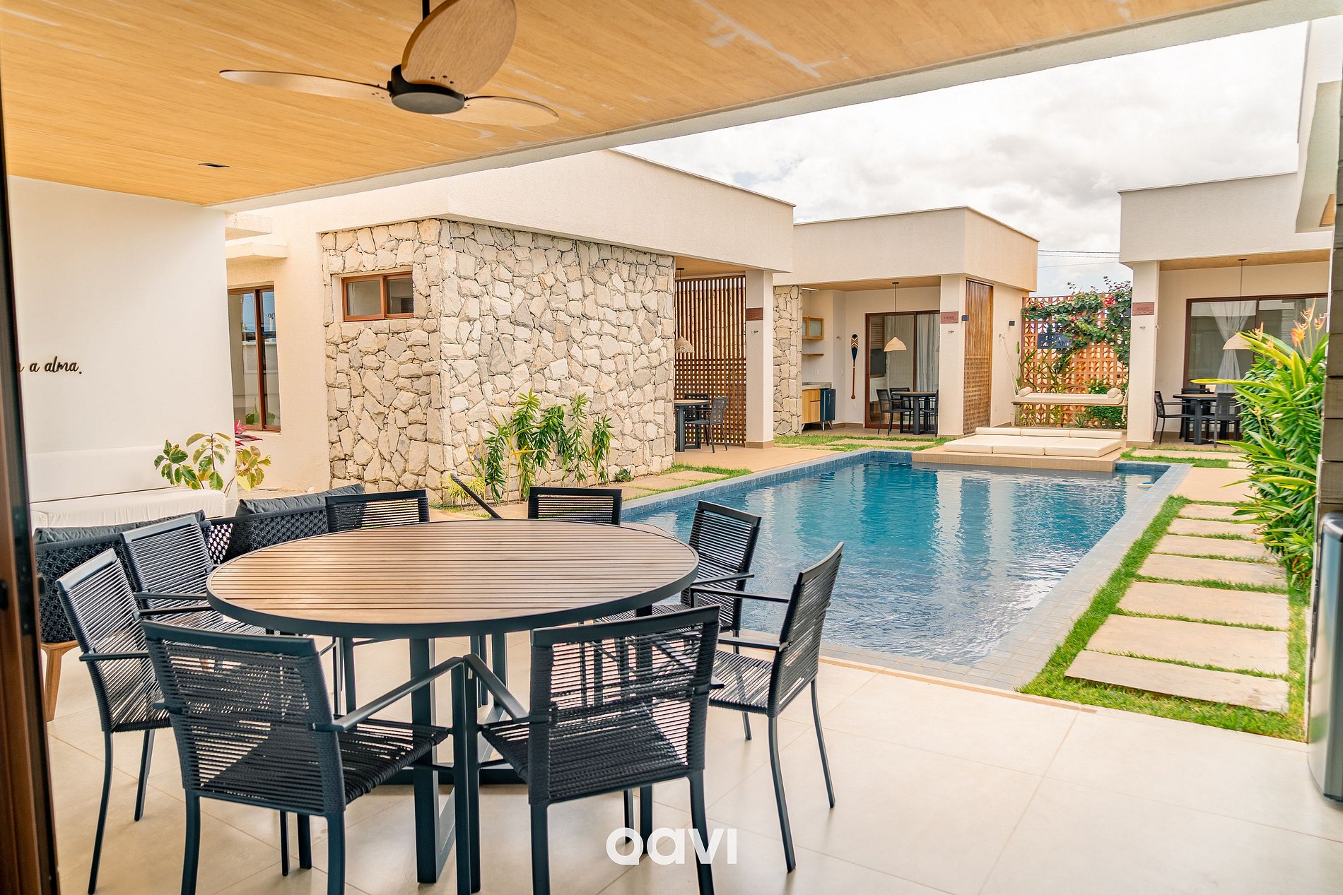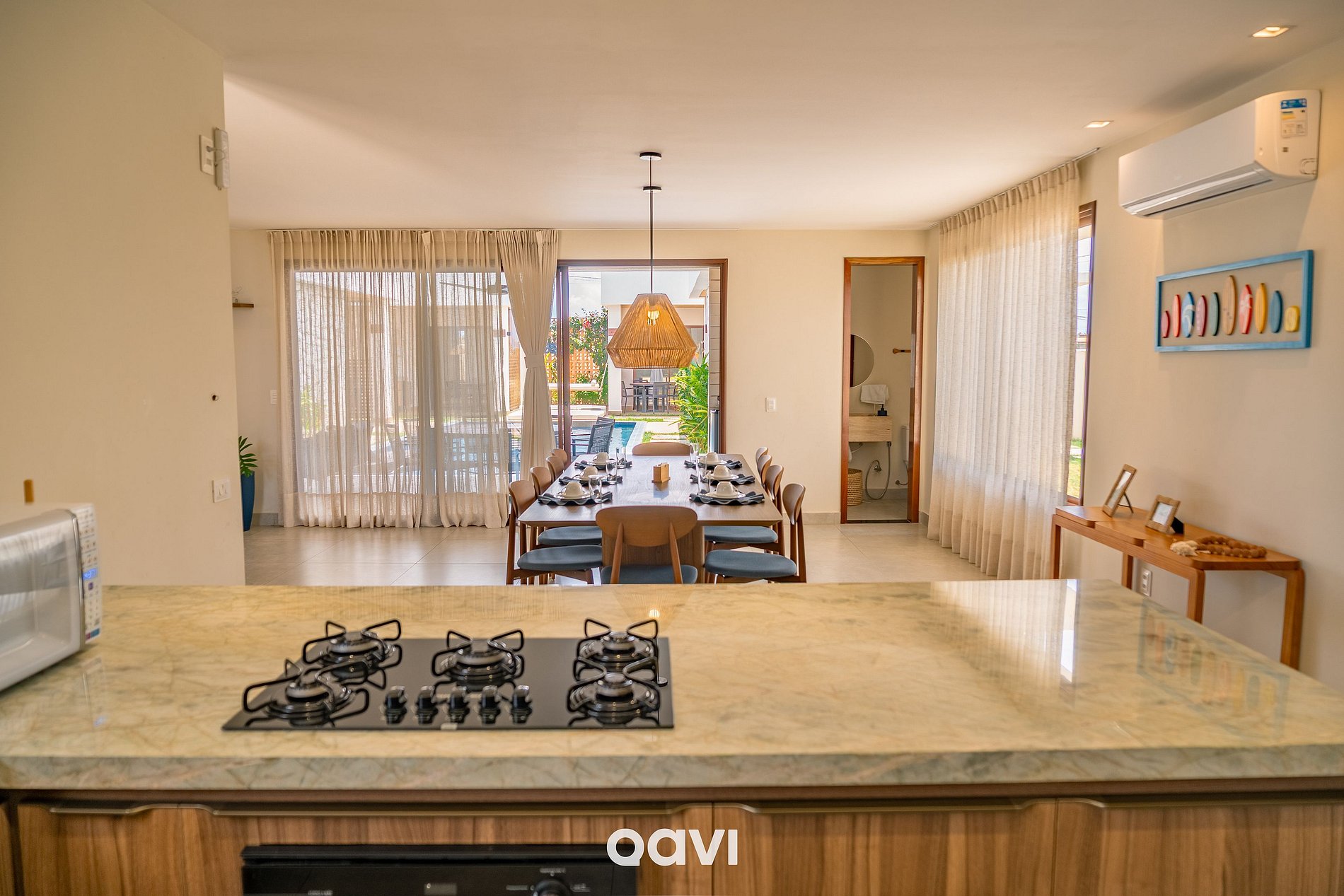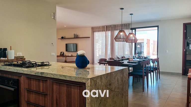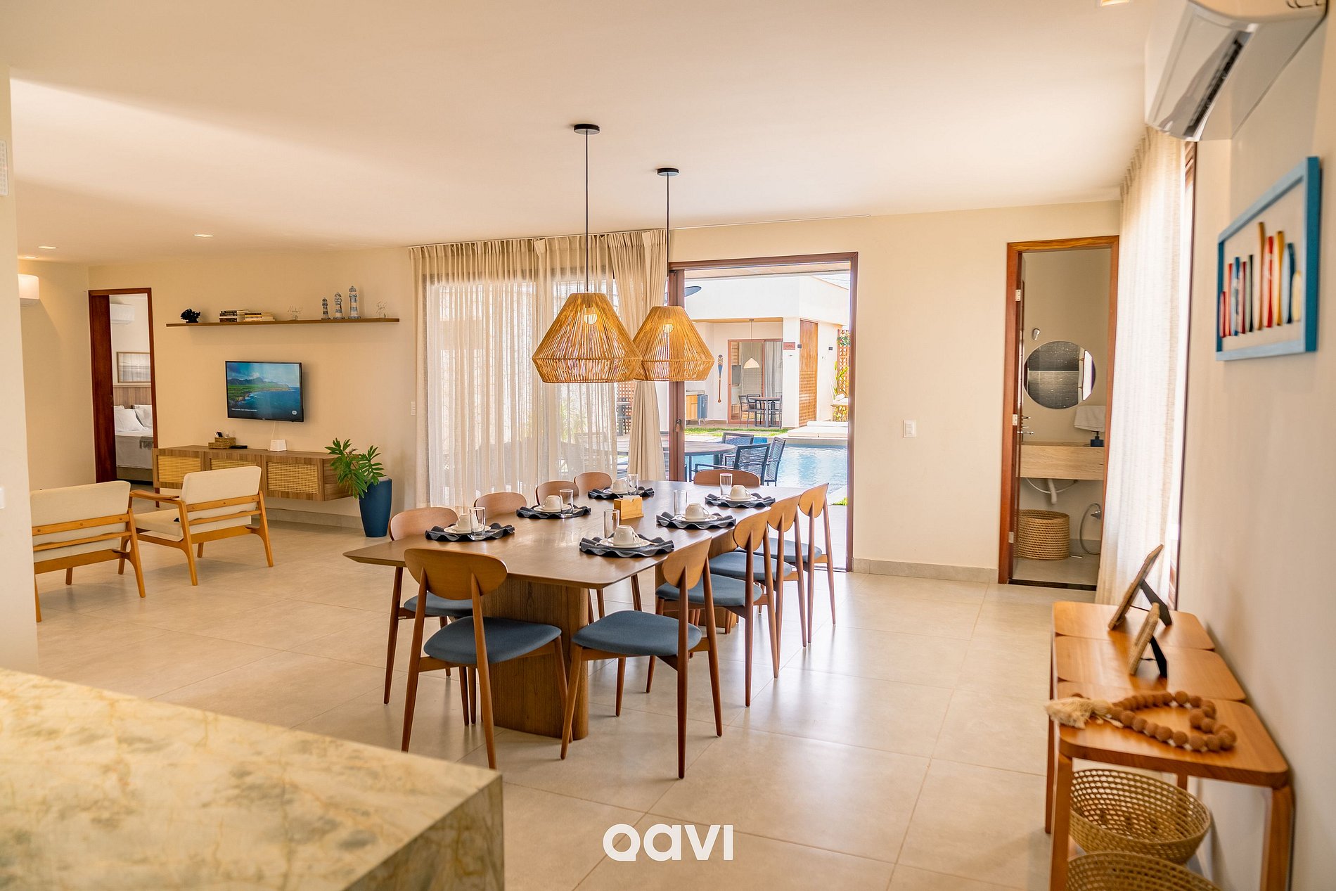- A casa conta com uma ampla piscina privativa, perfeita para relaxar e reunir familiares e amigos. Além de um ambiente totalmente climatizado, com sofá retrátil, poltronas, Smart TV, mesa de jantar para 10 pessoas e bancada em mármore com banquetas.