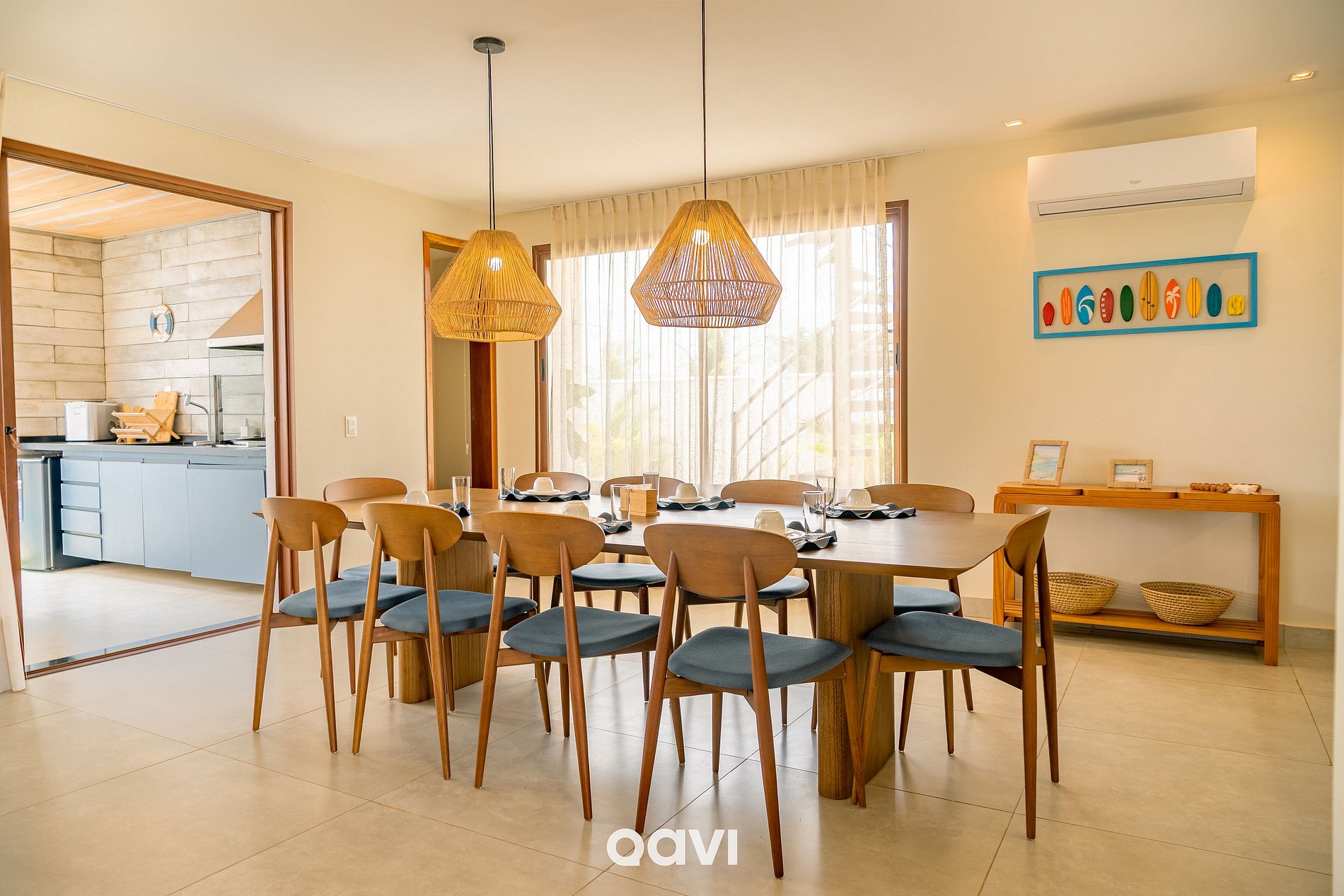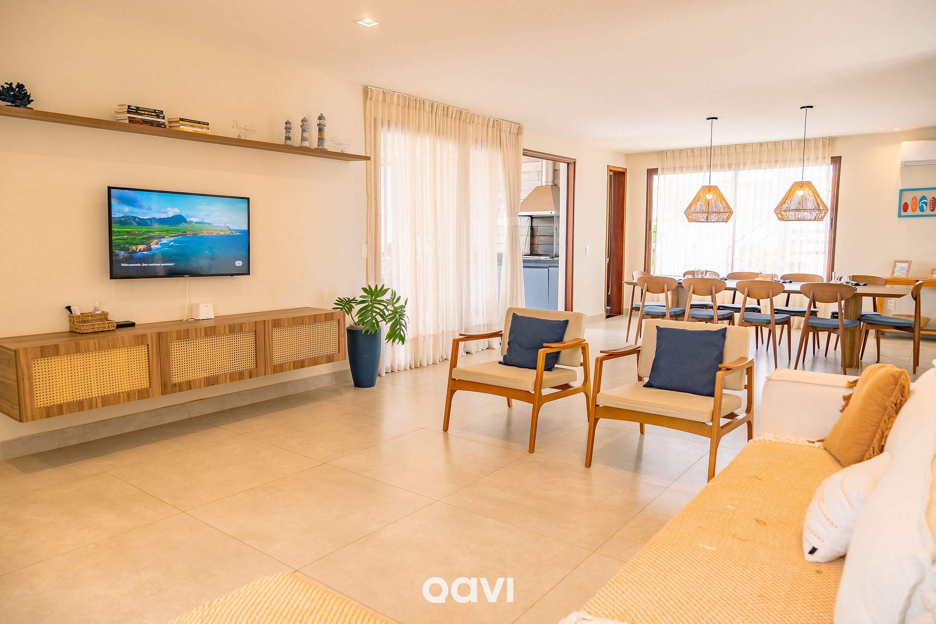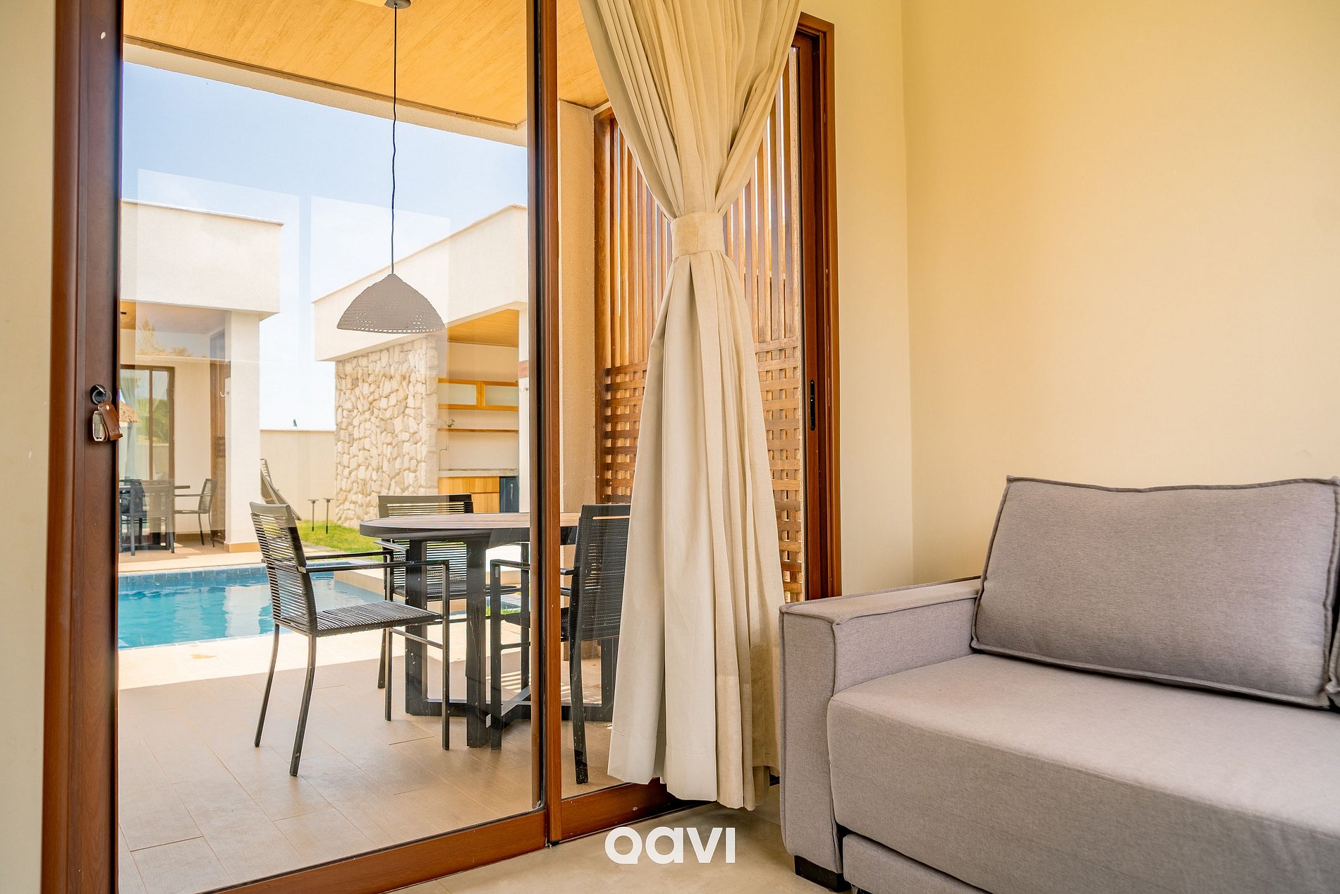 - A casa conta com uma ampla piscina privativa, perfeita para relaxar e reunir familiares e amigos. Além de um ambiente totalmente climatizado, com sofá retrátil, poltronas, Smart TV, mesa de jantar para 10 pessoas e bancada em mármore com banquetas.