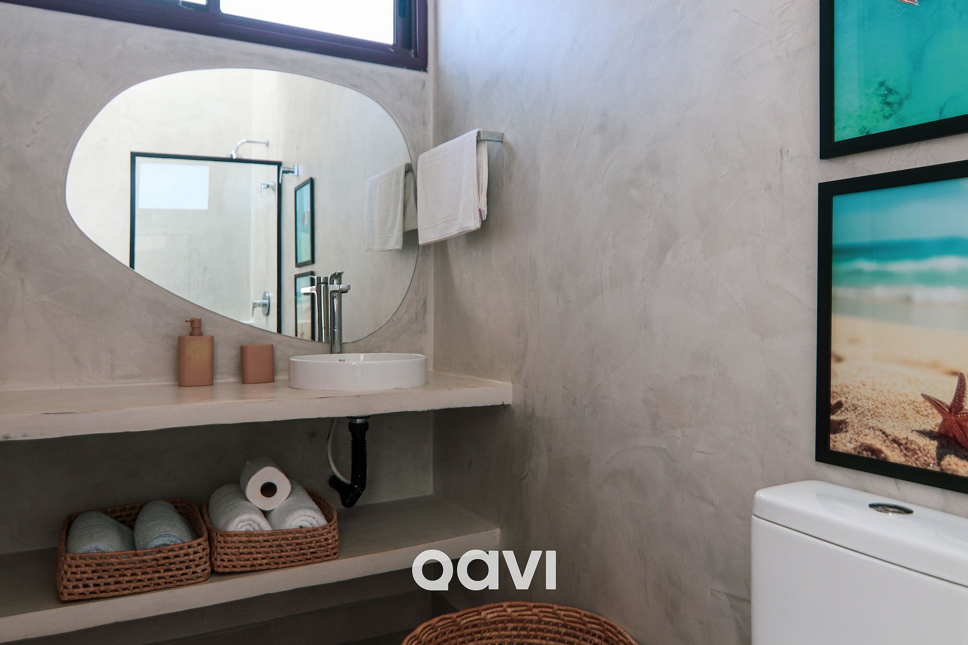 Lavabo: localizado ao lado da mesa de jantar, é um banheiro com vaso, pia e espelho.