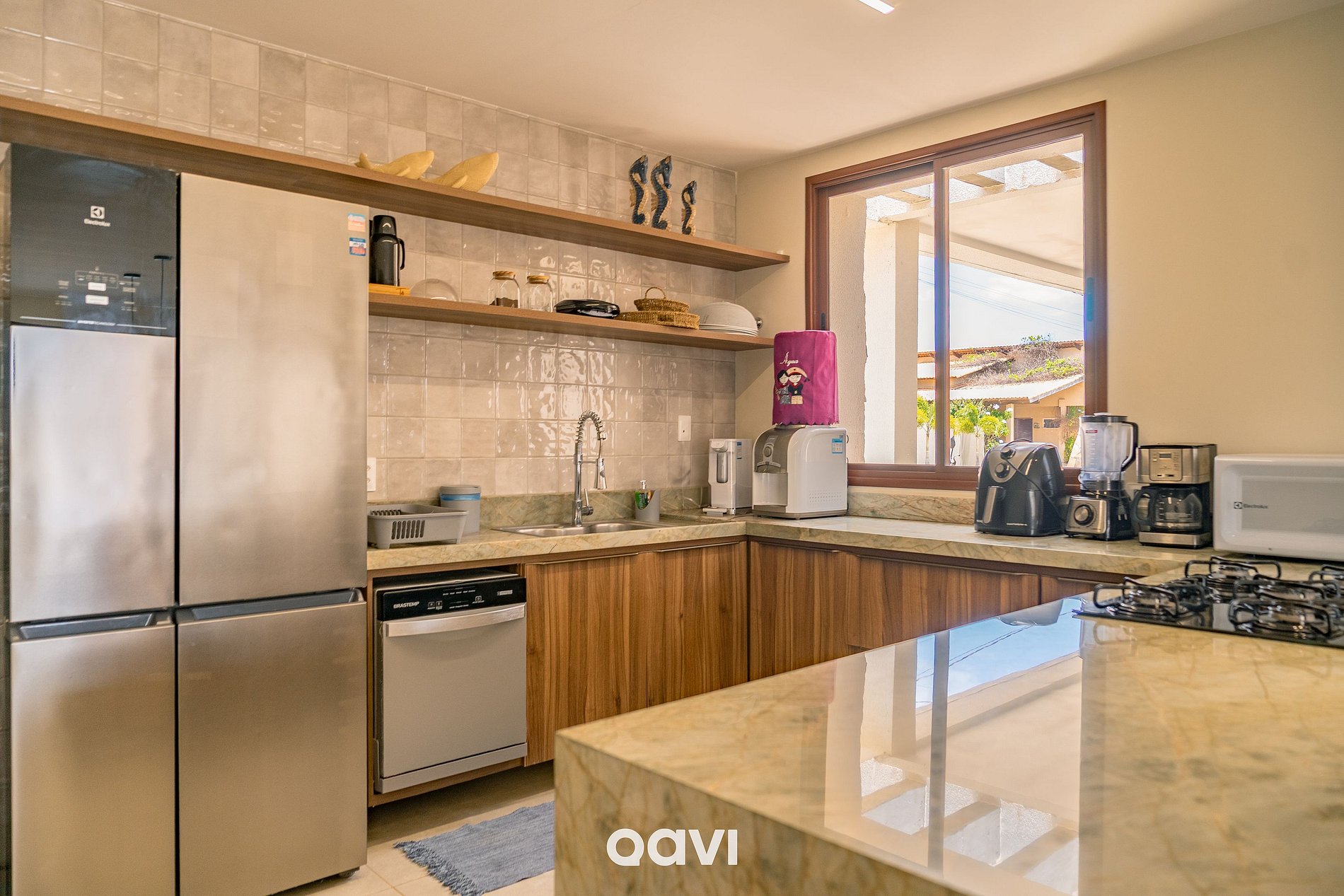 - A cozinha é completa, equipada com fogão cooktop 5 bocas, forno elétrico, geladeira duplex, freezer vertical, lava louças, micro-ondas, airfryer, liquidificador, torradeira, filtro de água e todos os utensílios e louças necessários para o dia a dia. Há também um lavabo social junto à sala de jantar.