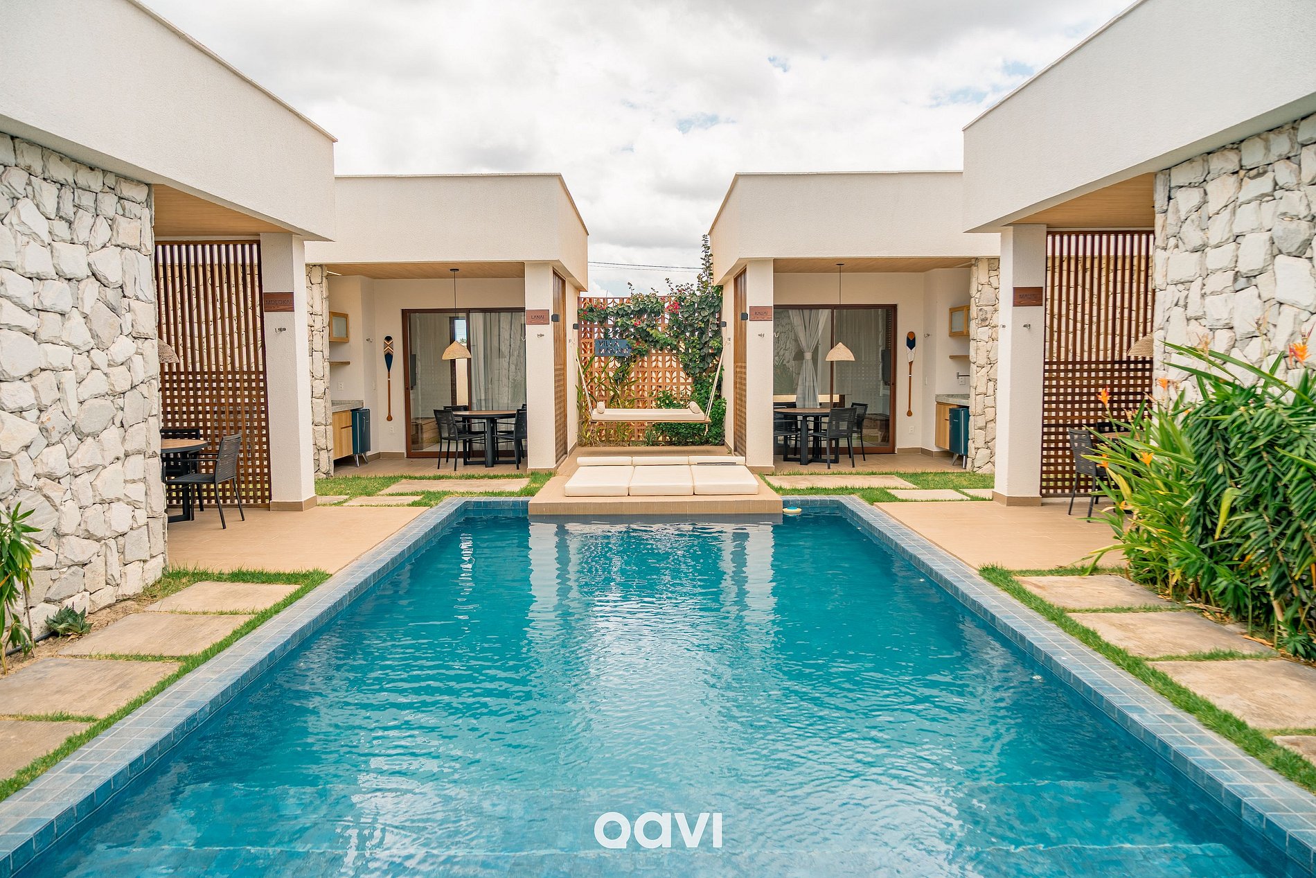 - 4 suítes externas, todas idênticas, cada uma com varanda privativa frente à piscina, mesa com 4 lugares, pia e frigobar, cama king + cama de solteiro acoplada, sofá-cama para 2 pessoas, Smart TV, guarda-roupas e banheiro privativo com chuveiro aquecido via energia solar.