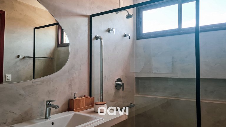 - 1 suíte interna adaptada para cadeirantes, com cama queen + cama de solteiro acoplada, Smart TV, armários, banheiro adaptado com barras de apoio, duas pias e chuveiro aquecido por energia solar.
