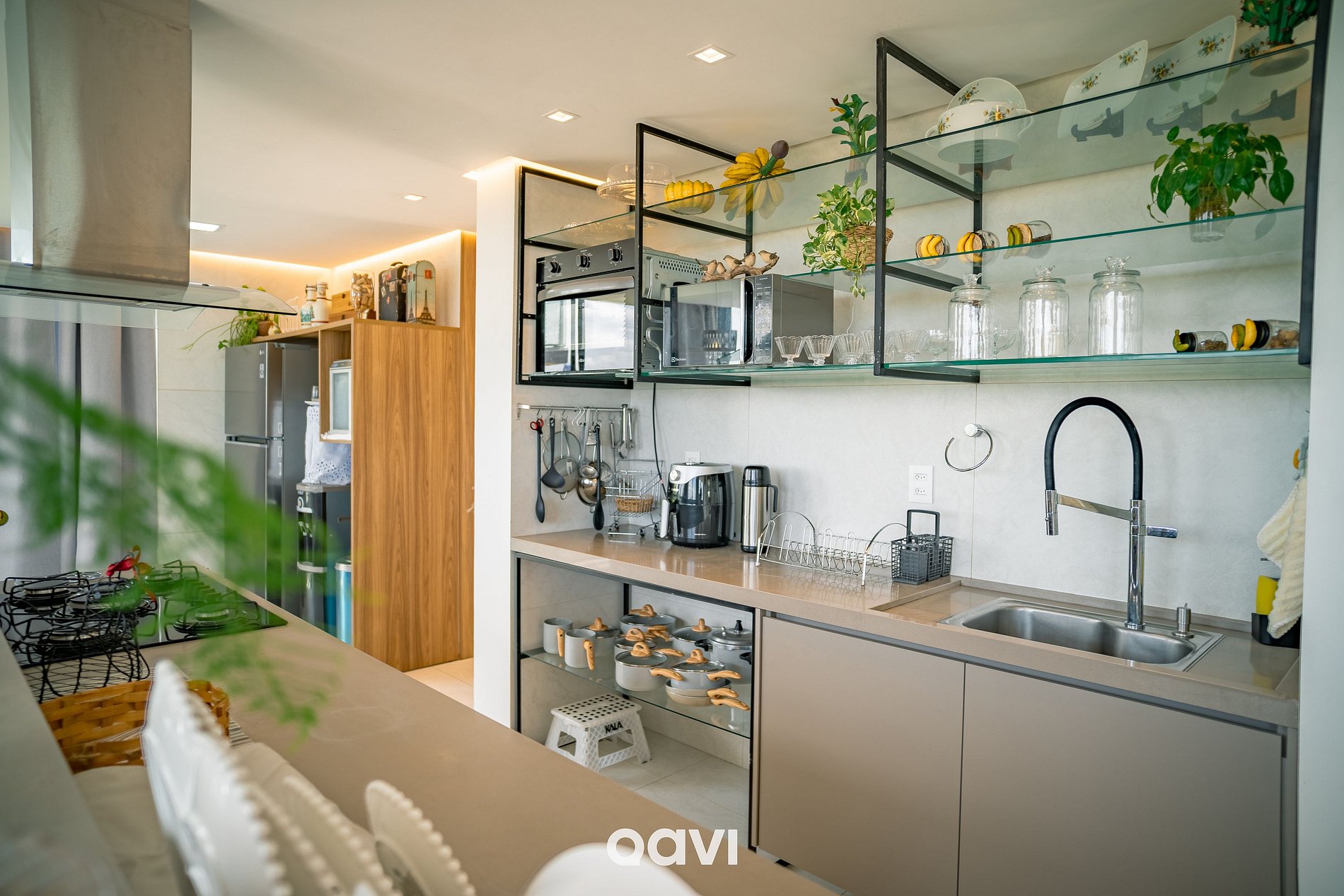 Sala: ampla, integrada à cozinha, com sofá e TV.