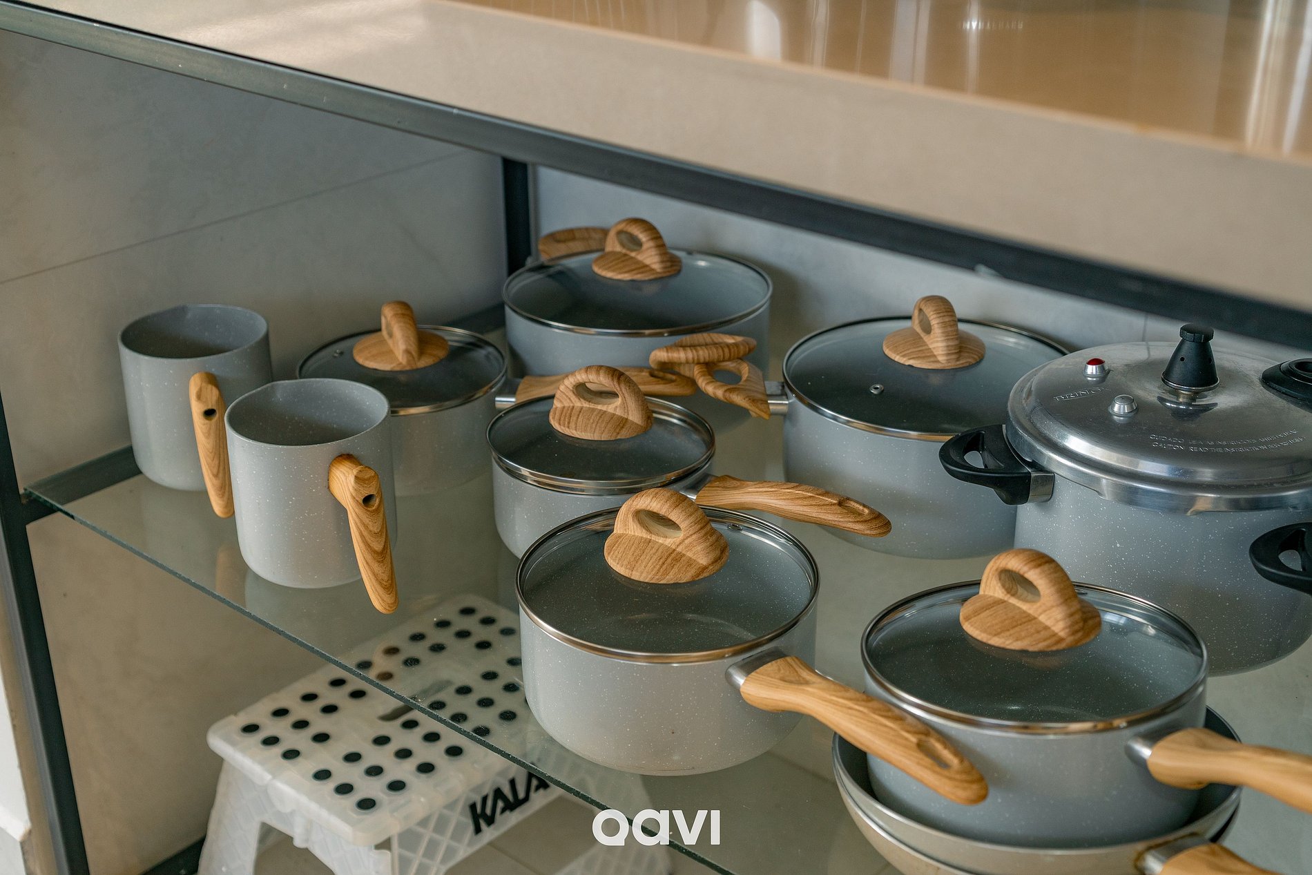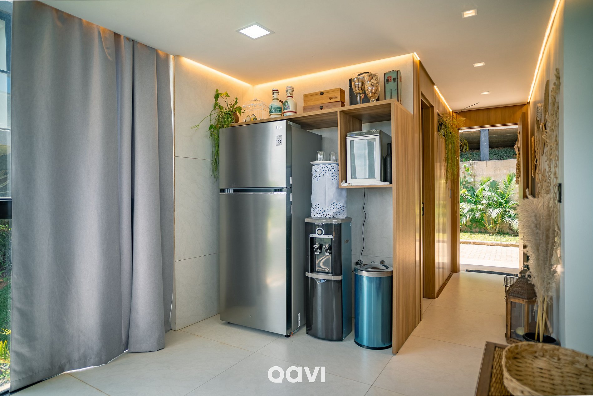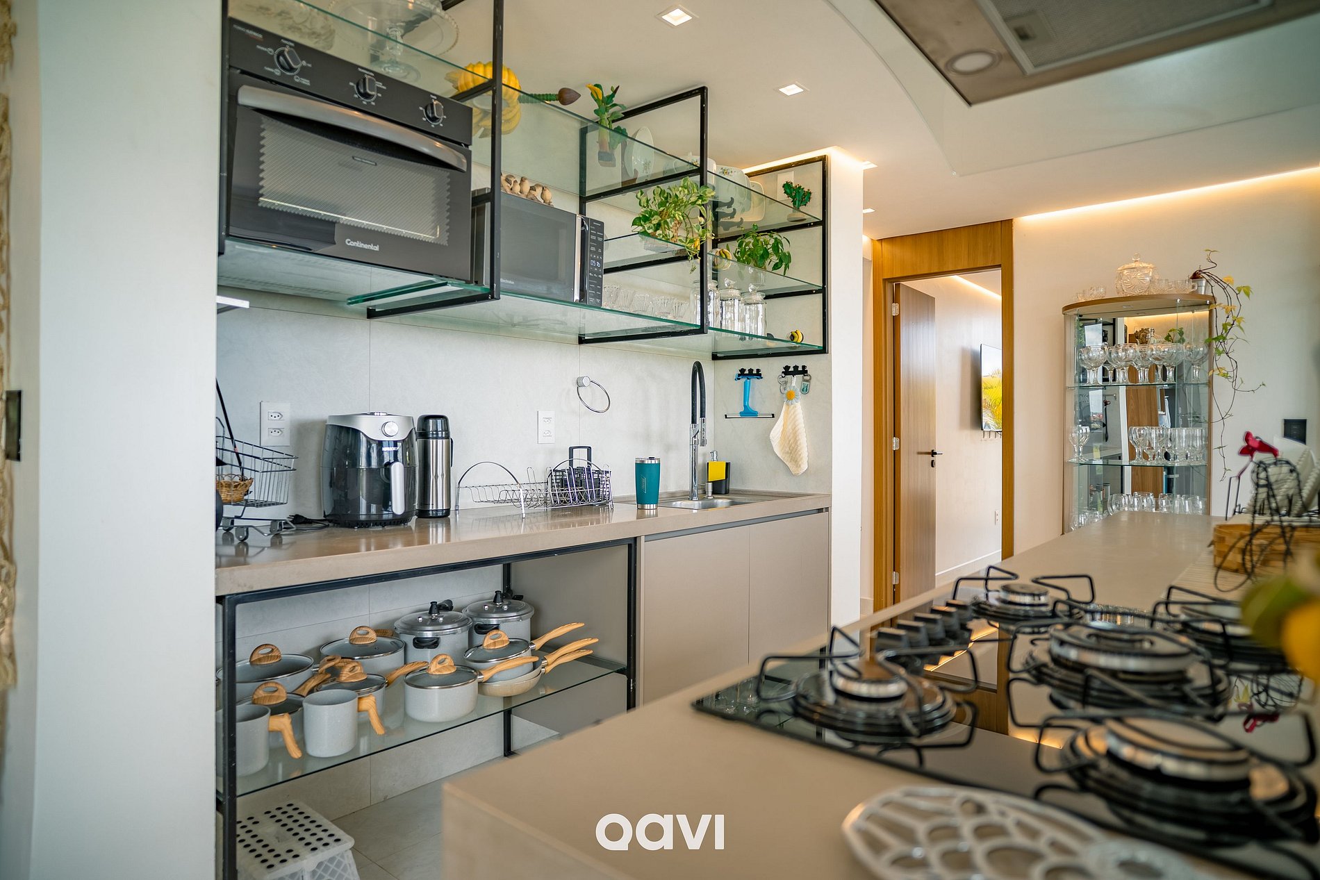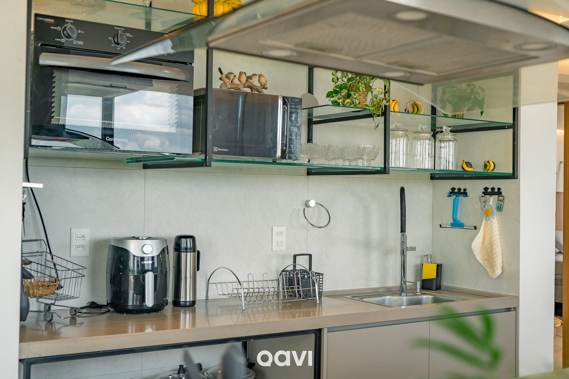 Cozinha: equipada com micro-ondas, geladeira, fogão, cafeteira, utensílios básicos (panelas, copos, taças e talheres).