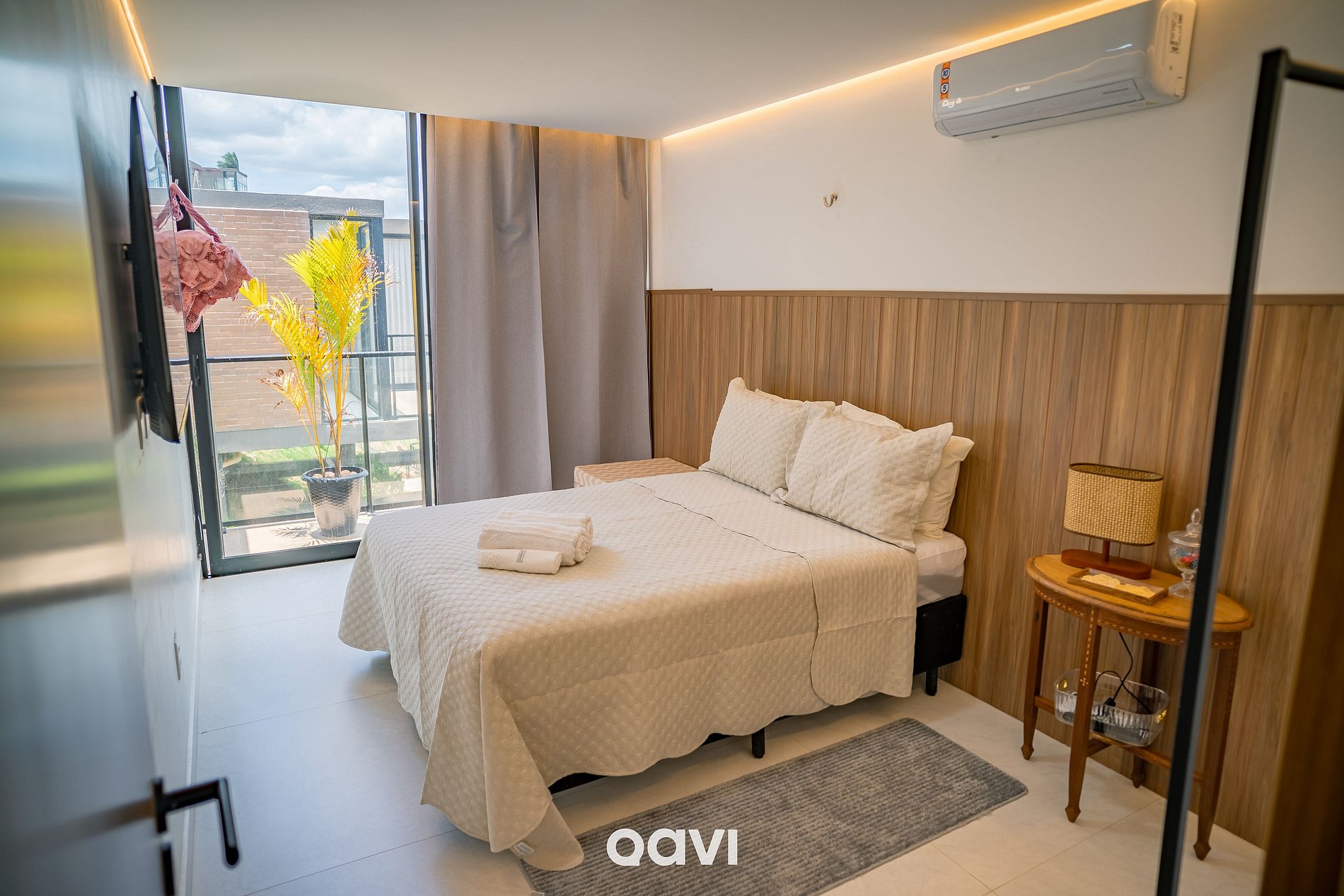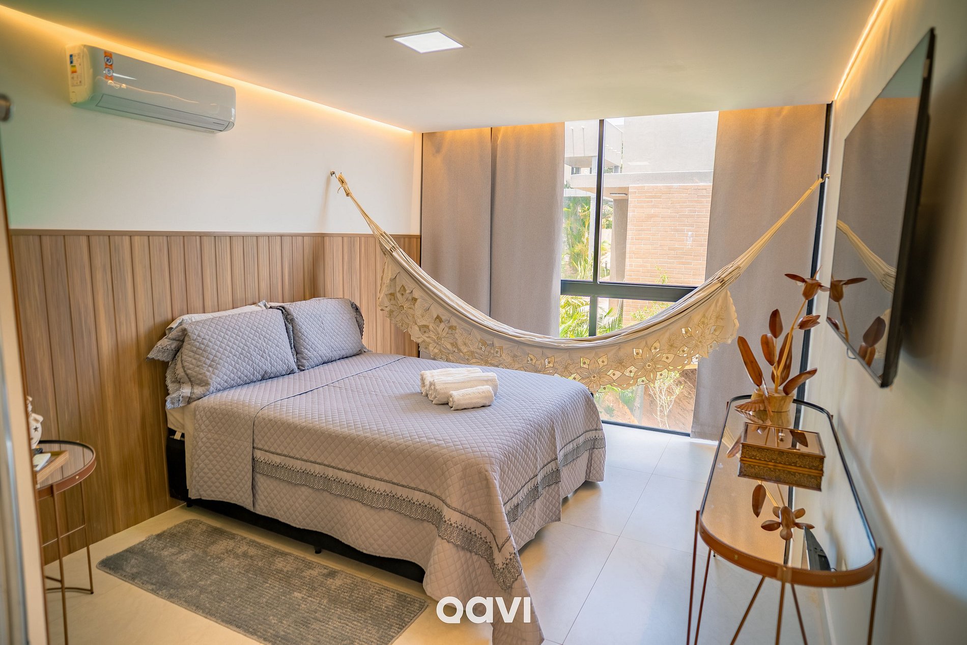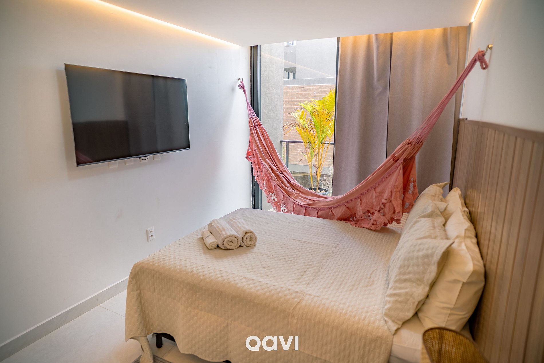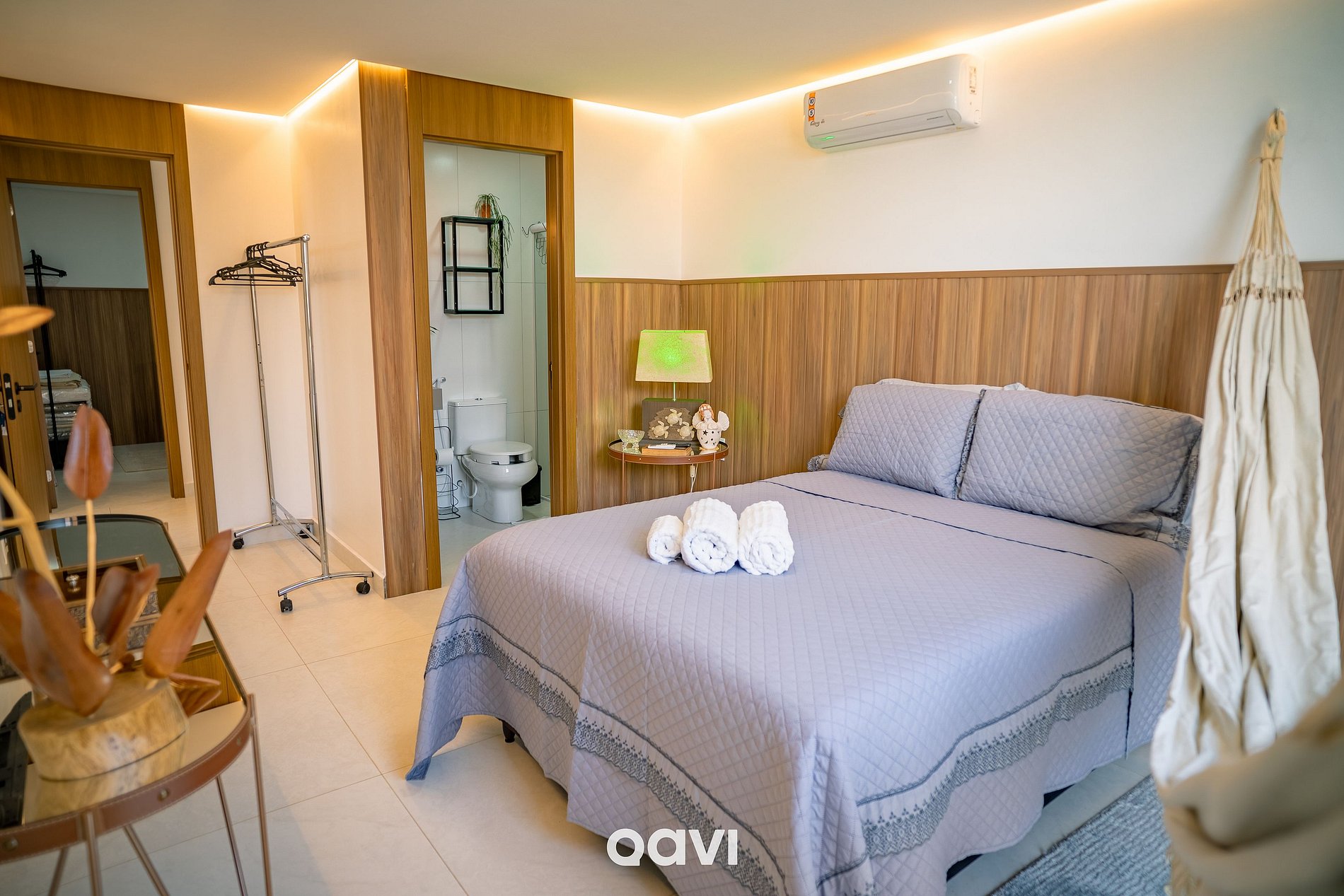 Quarto 1 (Suíte): cama de casal, TV, arara de roupas, cabides, ar-condicionado, rede de descanso e banheiro completo.