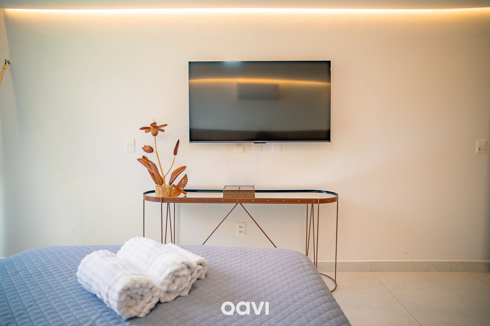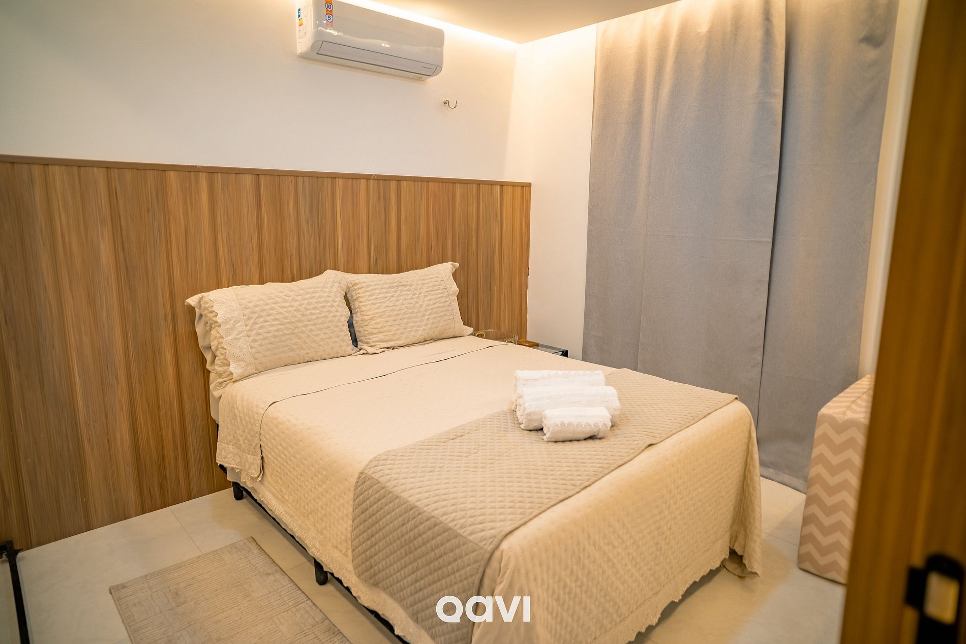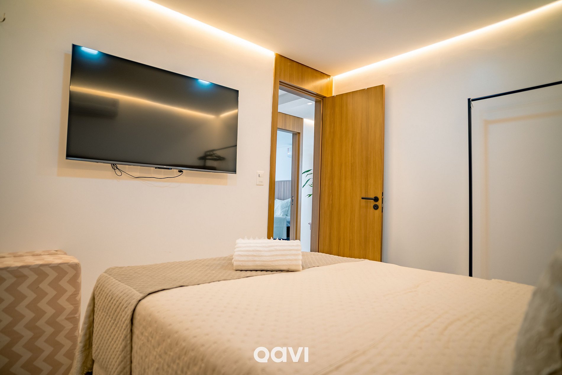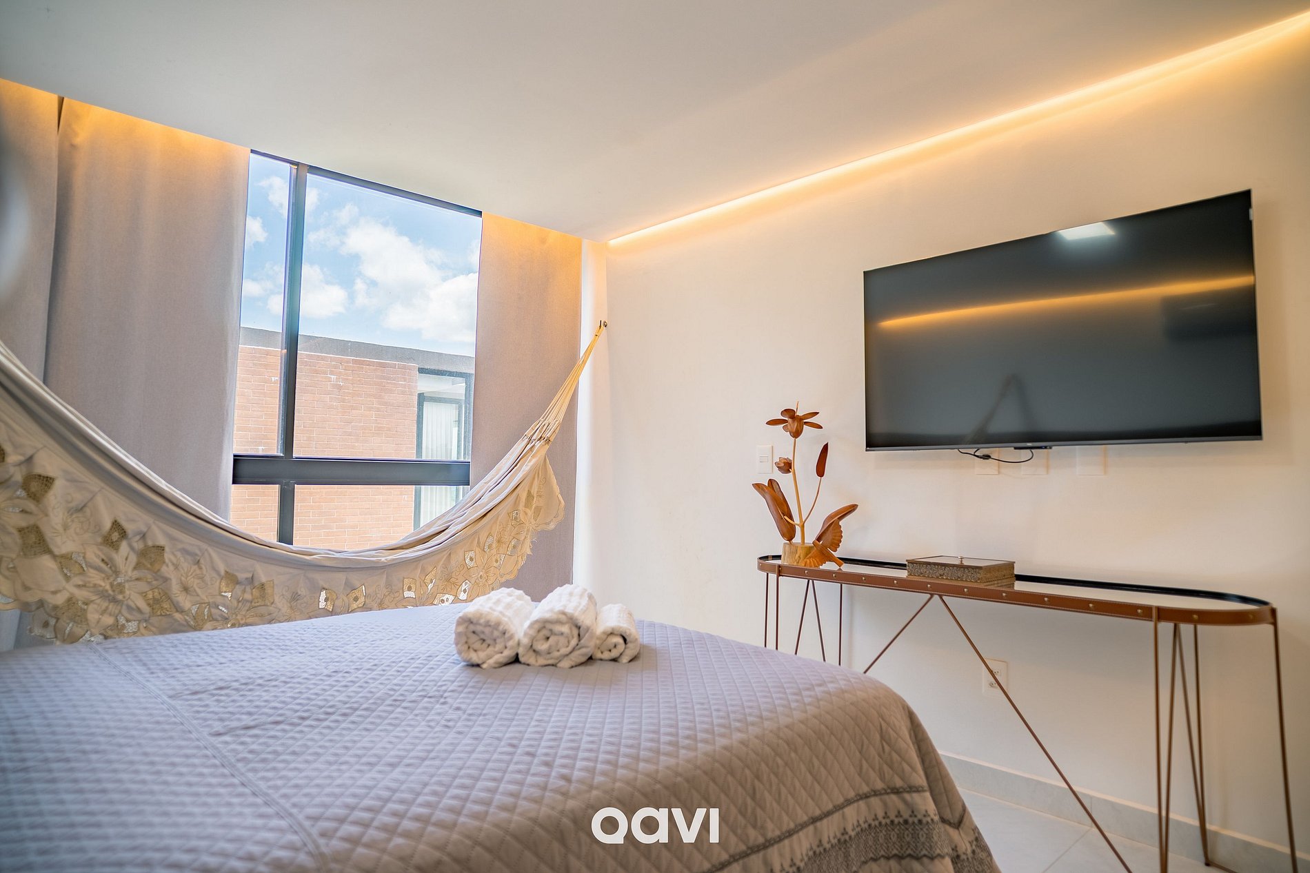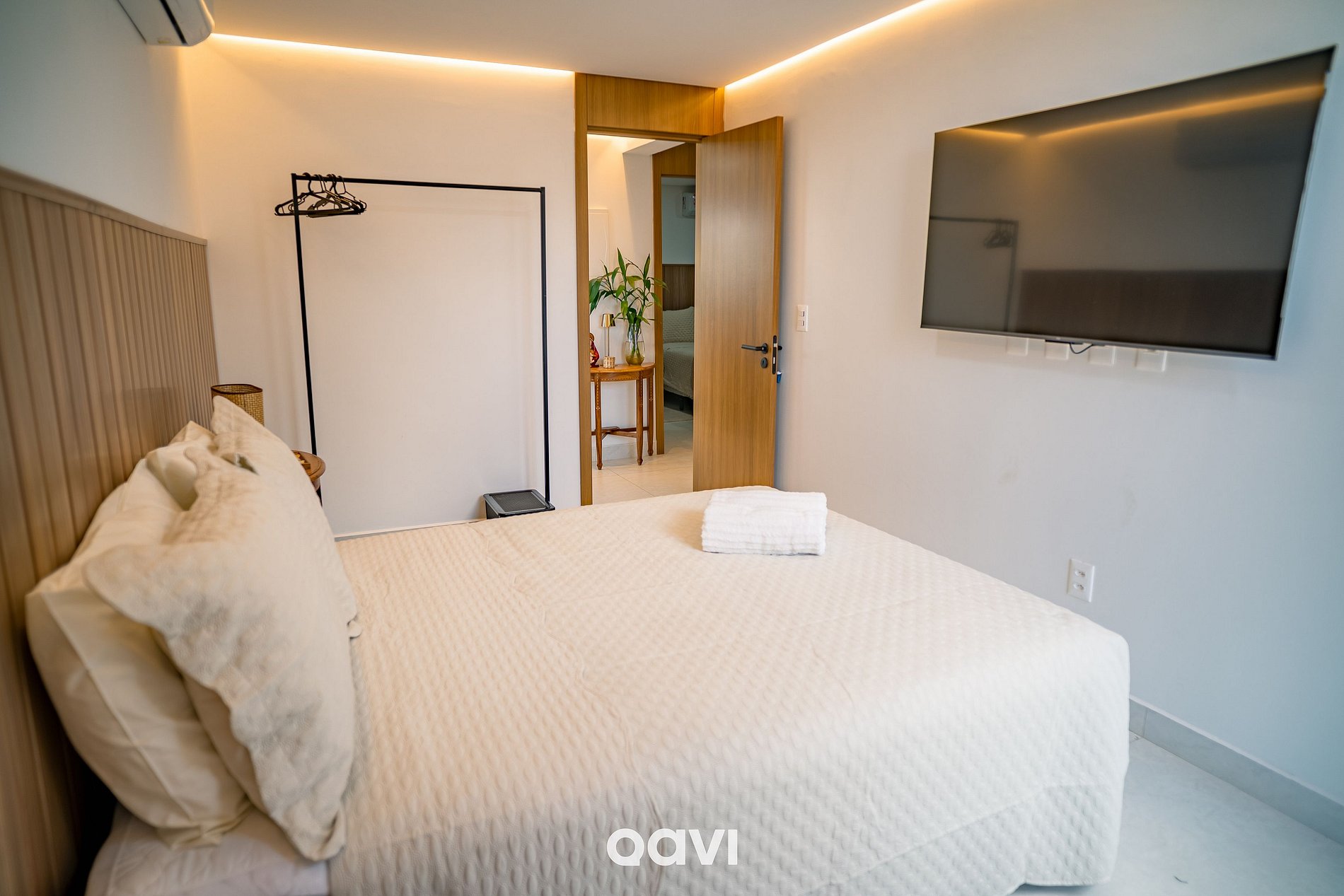 Quarto 1 (Suíte): cama de casal, TV, arara de roupas, cabides, ar-condicionado, rede de descanso e banheiro completo.