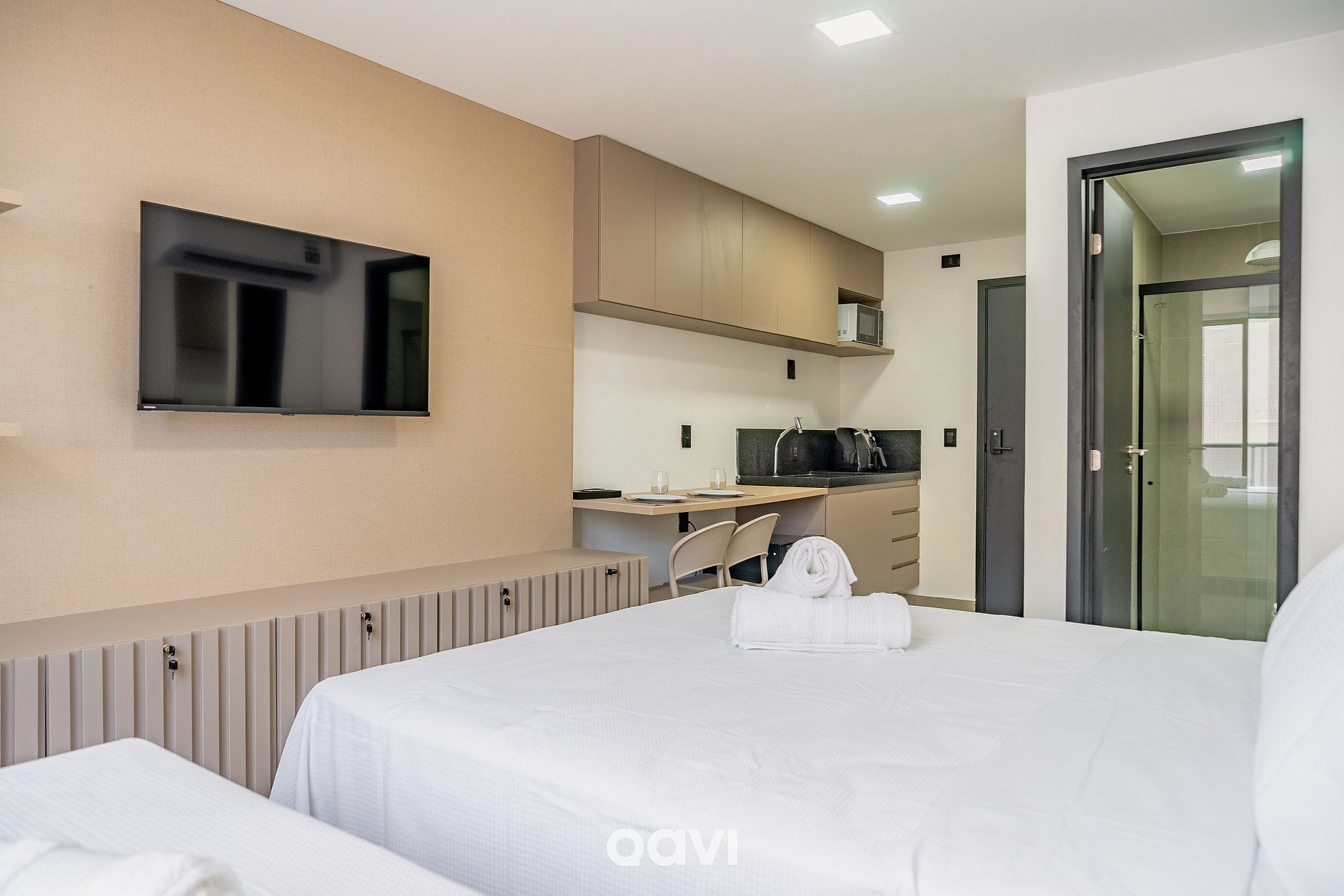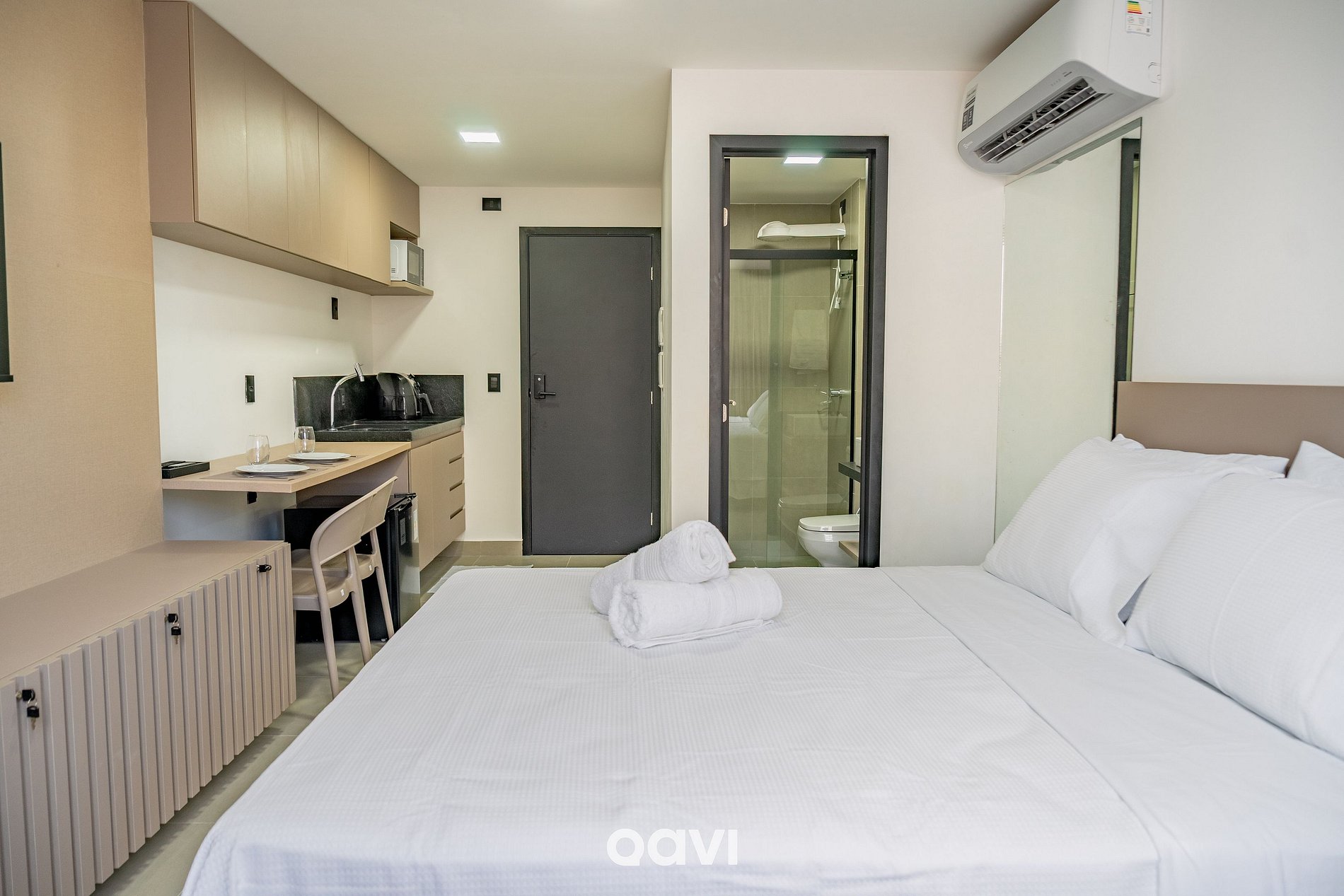 Este studio foi planejado para unir conforto e funcionalidade em um ambiente contemporâneo e acolhedor, pensado para proporcionar dias de descanso e conveniência.
