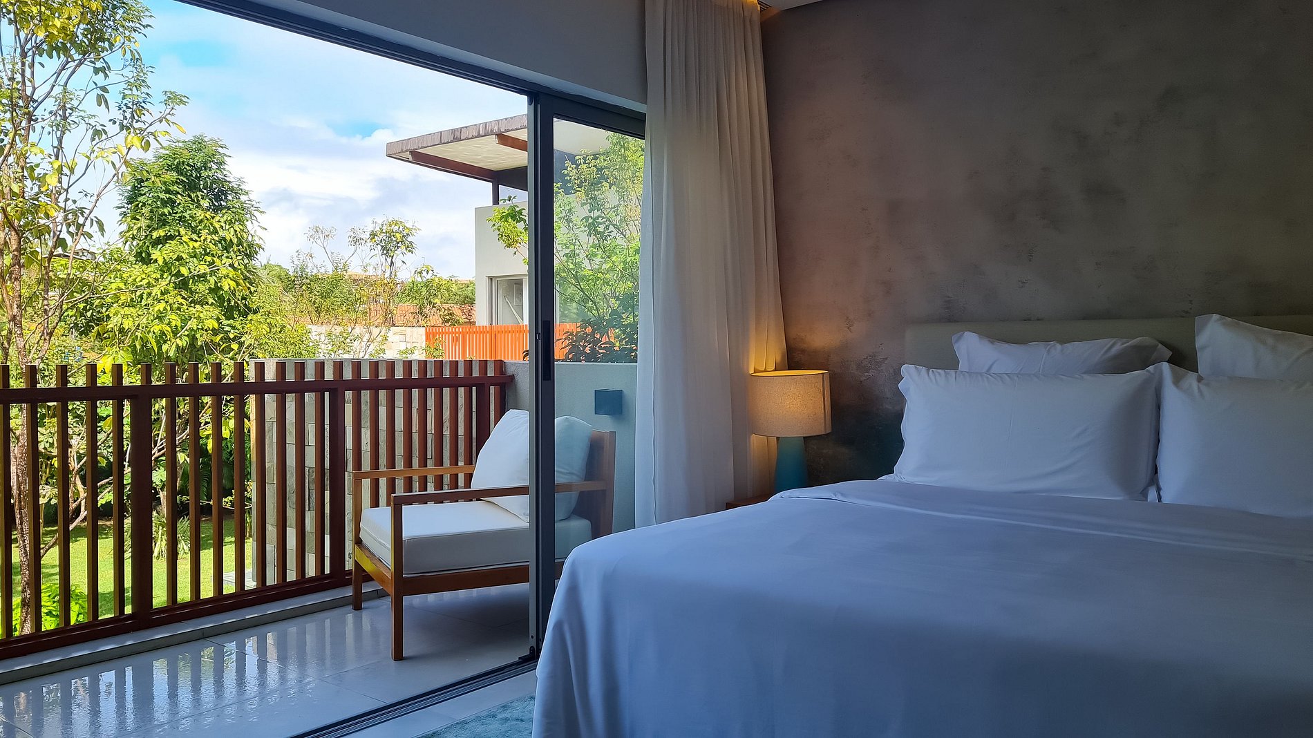 A unidade conta com 1 grande quarto, banheiro completo e varanda com vista para o jardim.