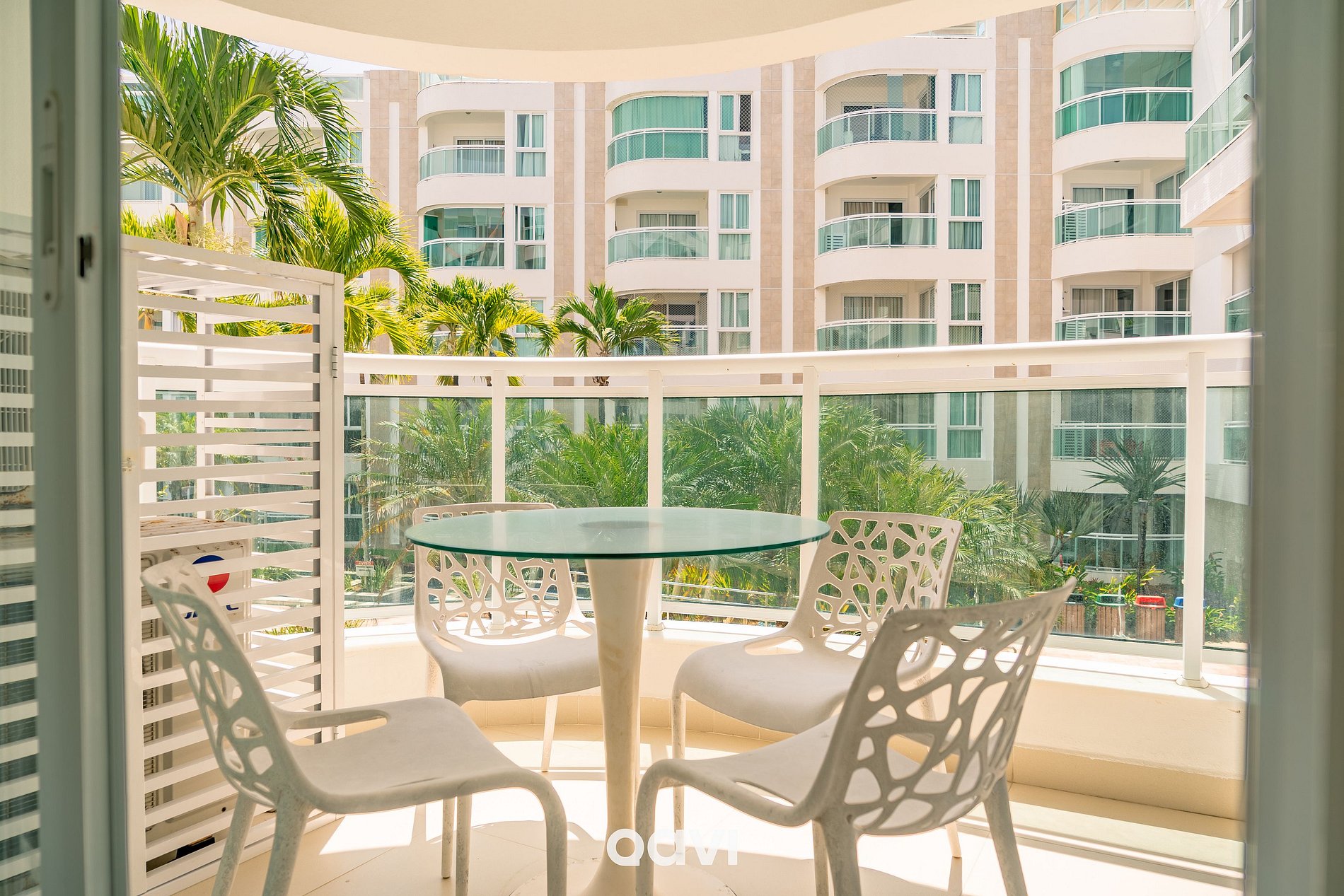 O apartamento possui decoração moderna e foi planejado para oferecer conforto e praticidade durante sua estadia. É um espaço superior com varanda privativa e vista para a área de lazer e para a Praia de Cotovelo.