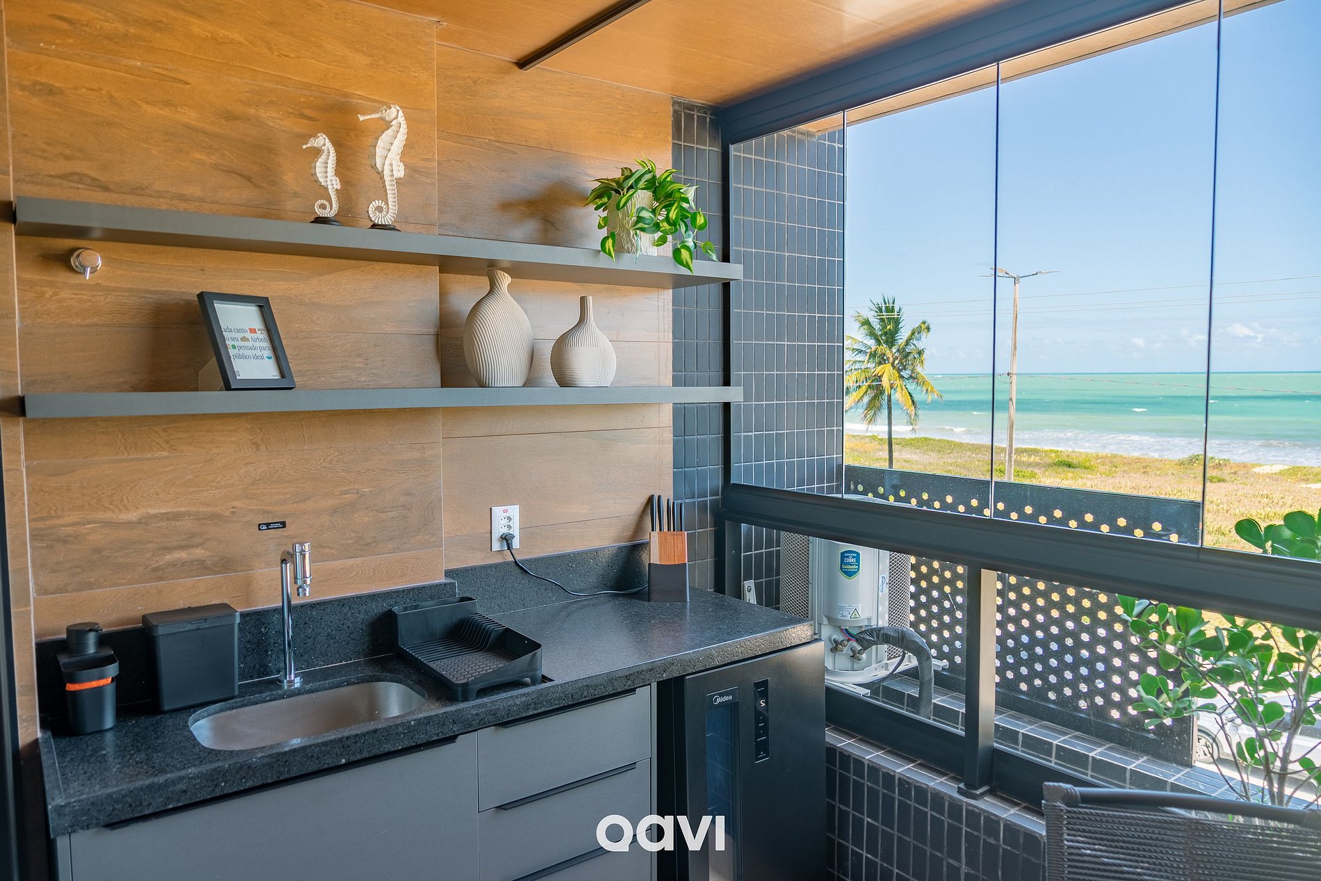 Varanda gourmet: espaço agradável para refeições e momentos de descanso, com vista para o mar.