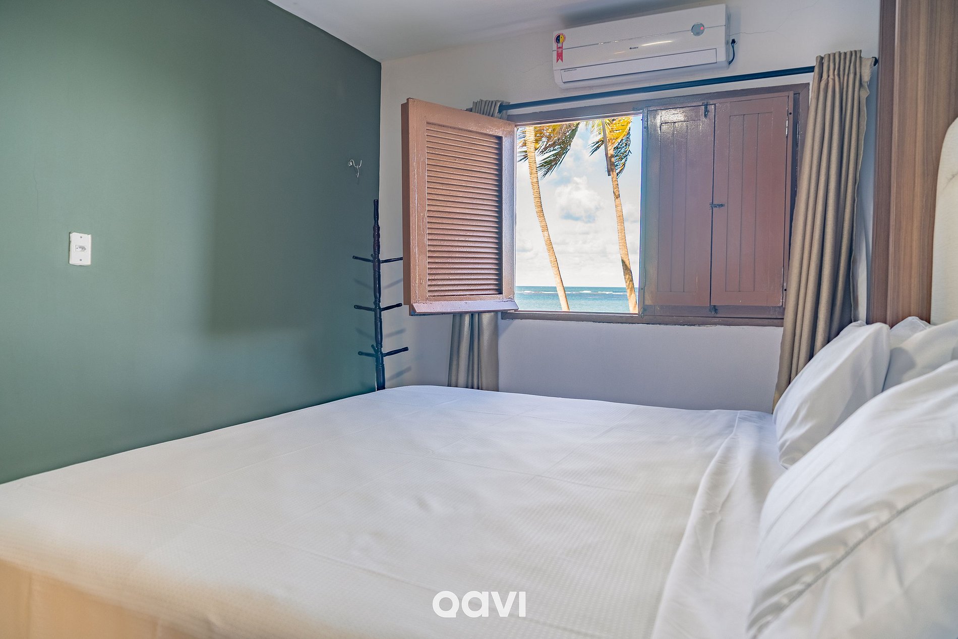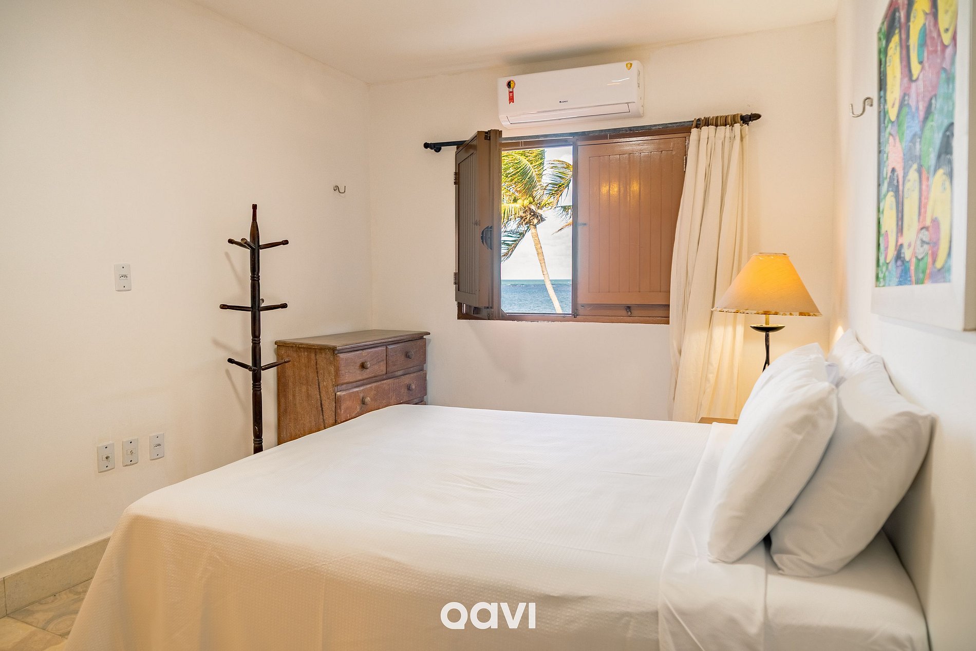 Suíte 2: 1 cama queen, ar-condicionado, armário e banheiro completo.