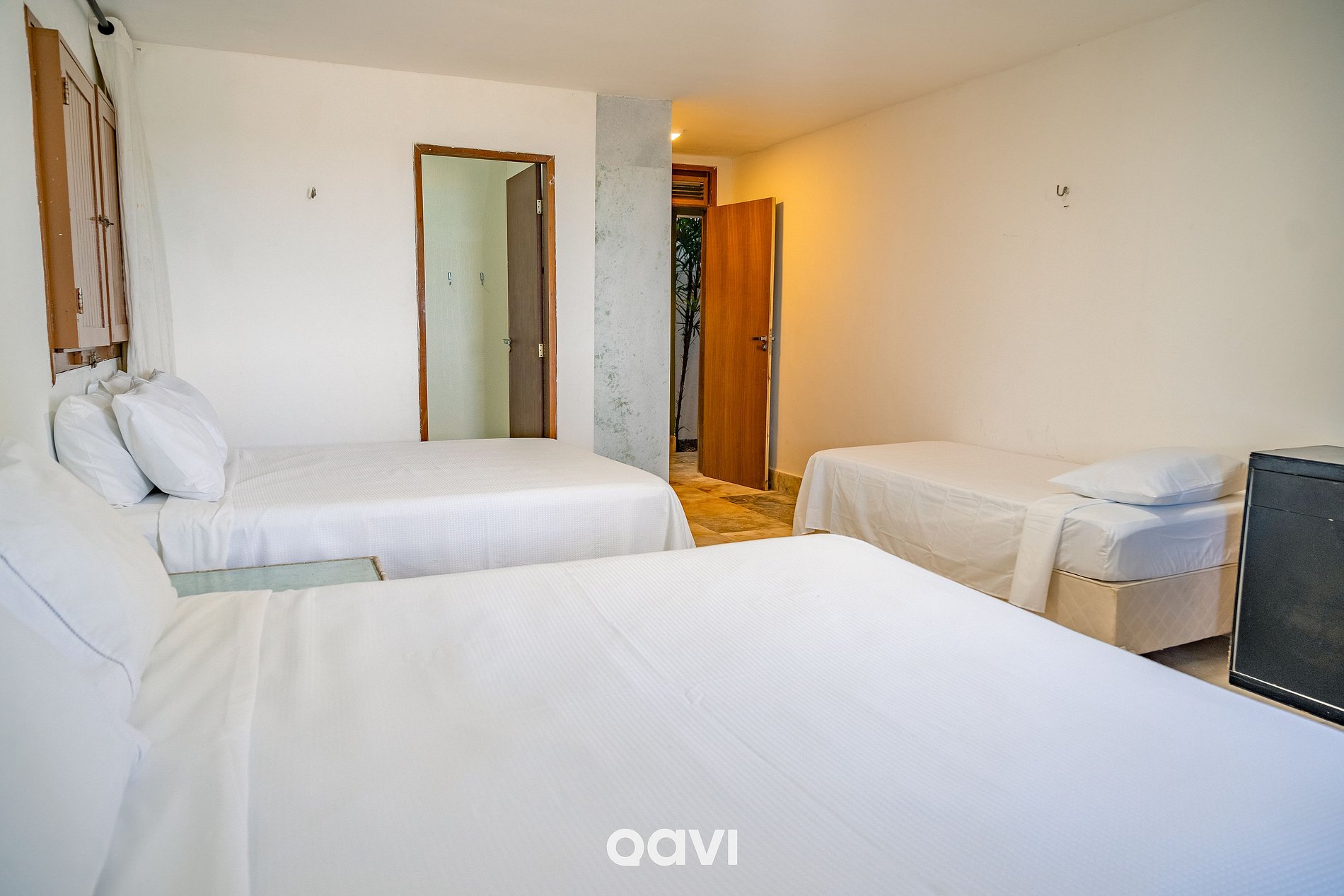 Suíte 5: 2 camas queen + 1 cama de solteiro, ar-condicionado, armário e banheiro completo.