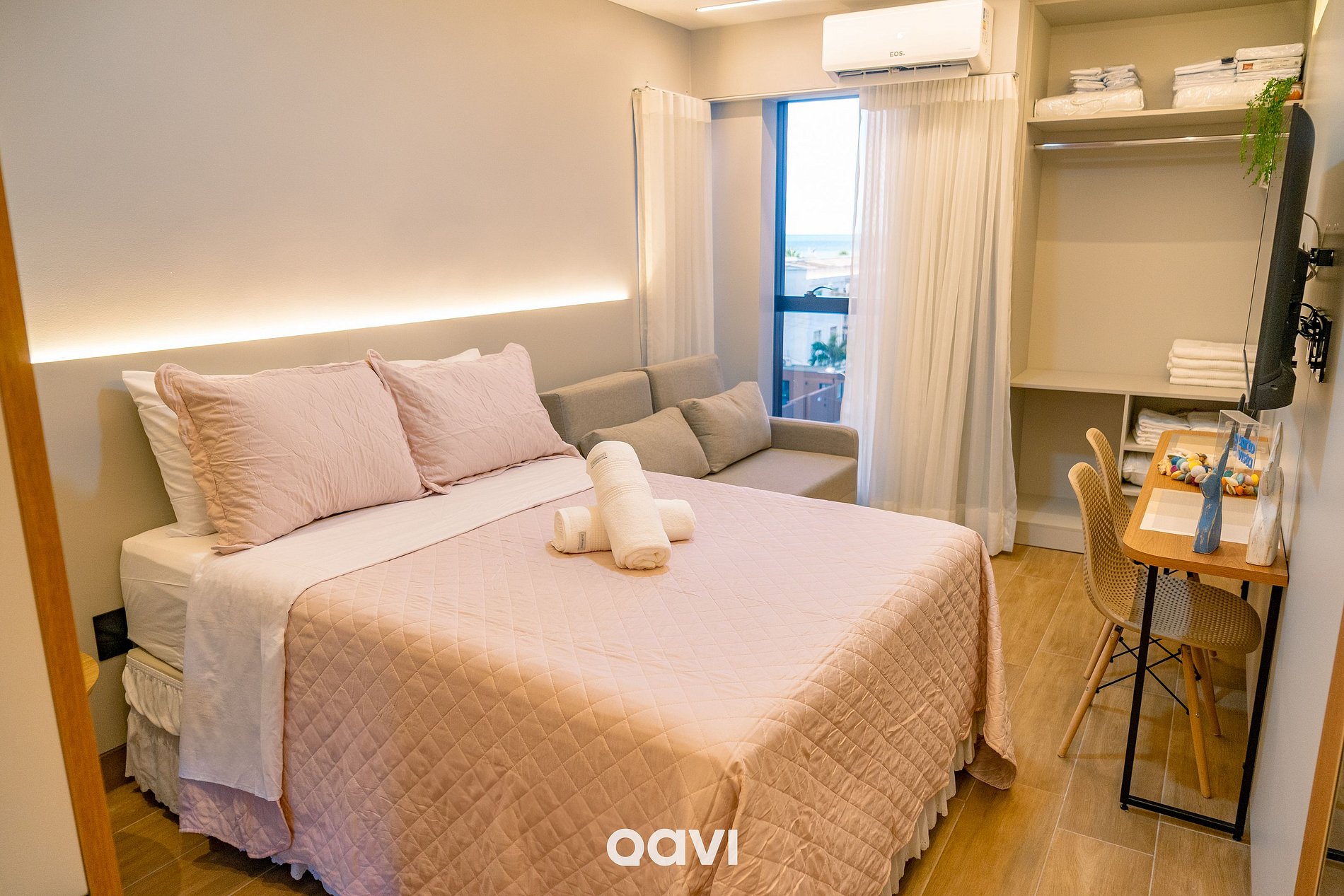 Suíte: 01 cama queen, 01 sofá-cama casal, ar-condicionado, armário com cabides e banheiro completo.