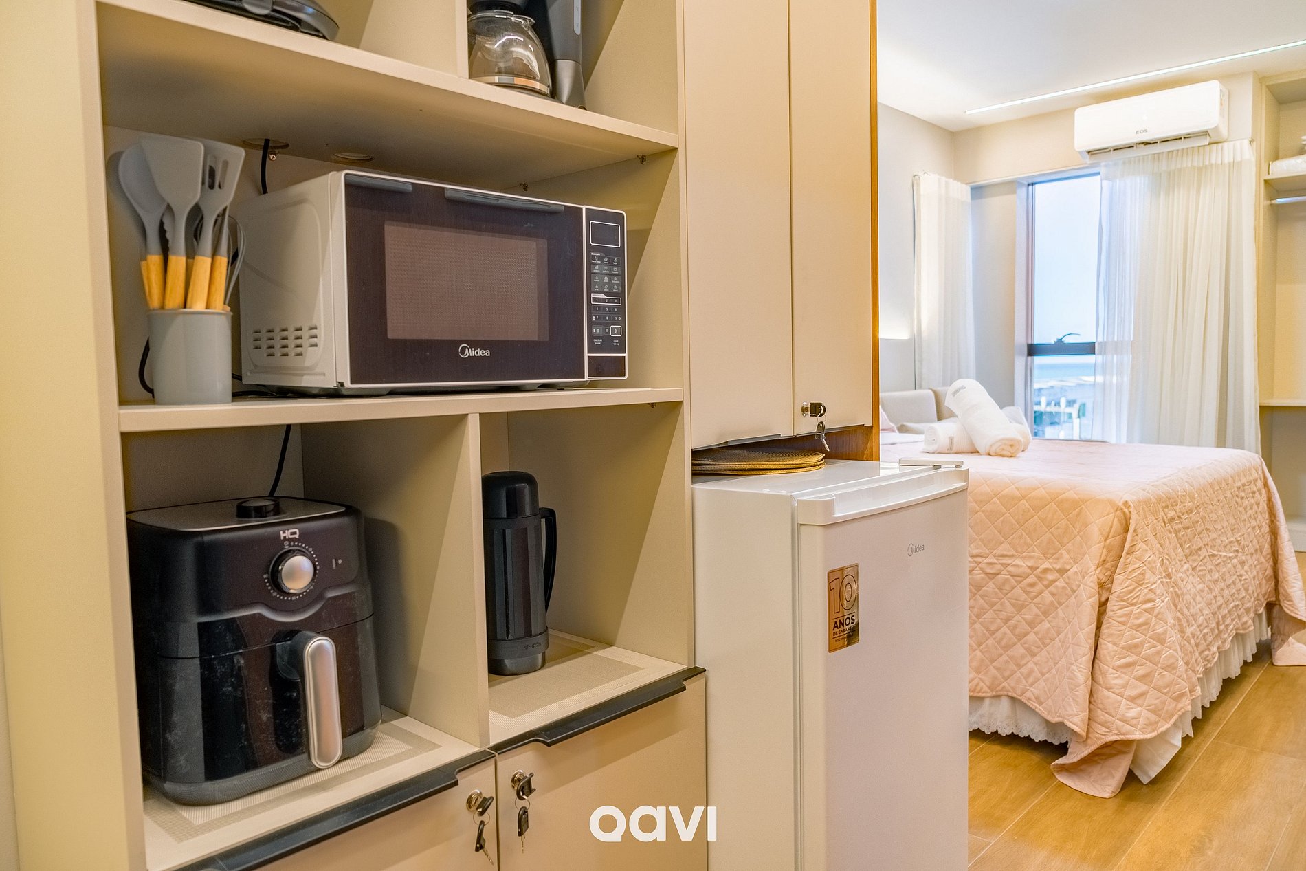 Cozinha: equipada com fogão elétrico, frigobar, micro-ondas, cafeteira elétrica, liquidificador, sanduicheira, air fryer e utensílios básicos (panelas, copos, taças e talheres).
